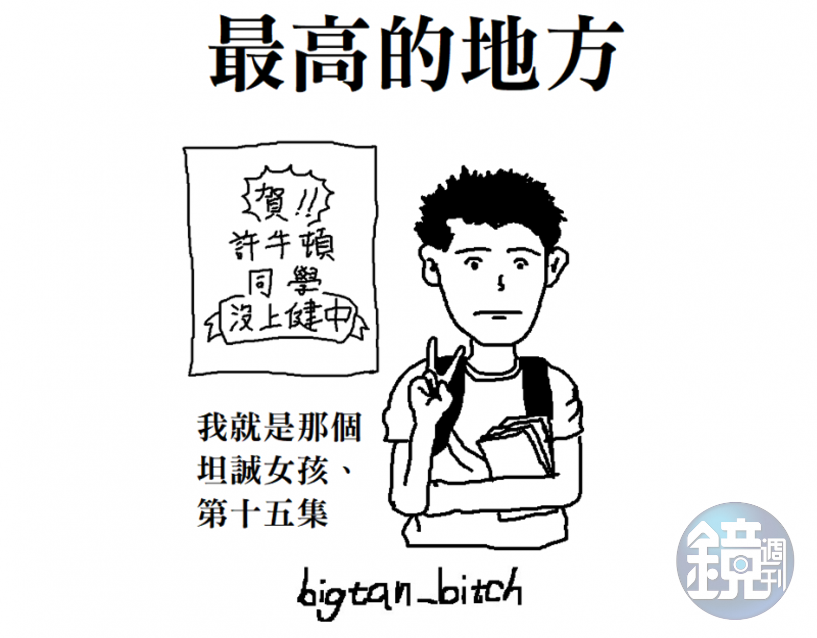 時間軸回到我沒上健中後的某天早晨。我爸用超粗的麥克筆在紙上面寫上:「賀!許牛頓同學沒上健中。」然後印了500張、把我推出家門,要我發450張,50張貼在補習班的榮譽榜,他下班會去幫我跟我的落榜榜單合照,讓我看看自己有多可悲。我藏著落榜榜單、臉臭得要命,學校的同學跟我不熟,沒人安慰我,只是跟著其他老師一直問我怎麼沒有上健中。