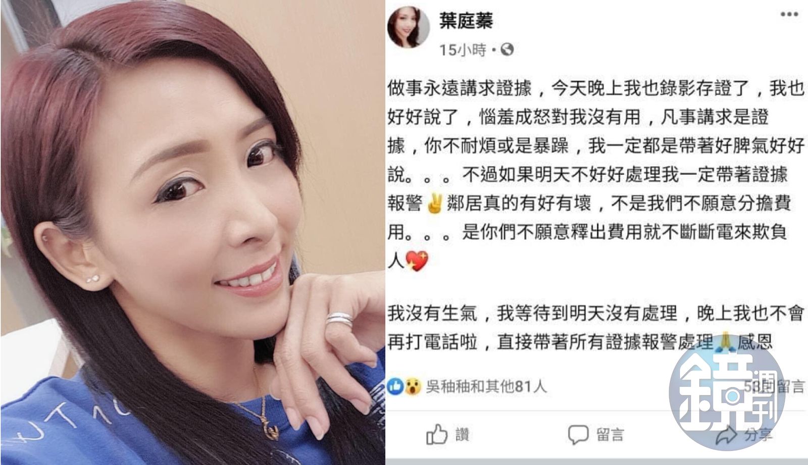 葉庭蓁透露過去也發生過颱風天,因雨勢過大,頂樓排水孔又遭住戶的花盆擋住無法及時排水,造成水淹至樓下,讓妹妹房間滲水,就怕引發電線走火的她還上門抗議,卻發現鄰居不在只好報警處理,破壞門鎖後才解除危機。如今惡鄰又再次無預警關閉總電源,讓她怒火難消,差點報警提告,還好鄰居自知理虧重開電源。但她也無奈表示台北市房價太貴,要不然也想搬離此處。