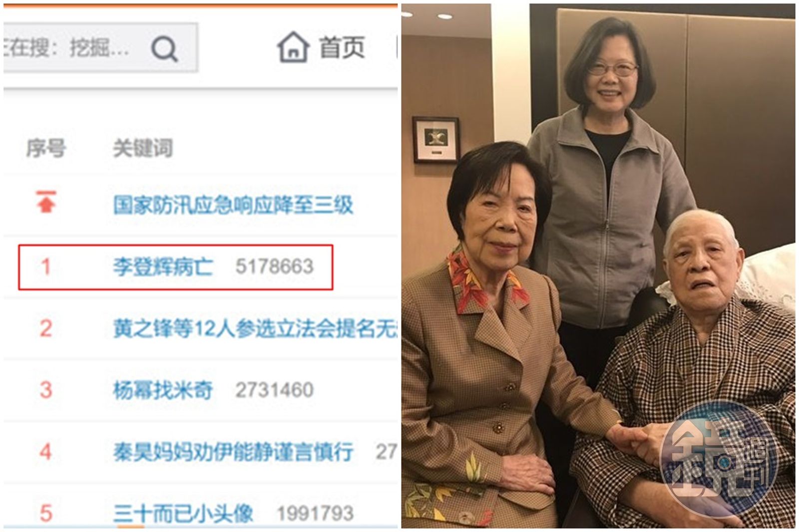 前總統李登輝離世消息,除了《新華社》《環球網》《人民日報》等官媒第一時間報導外,「李登輝病亡」每分鐘熱搜關鍵字更超過500萬的搜尋。