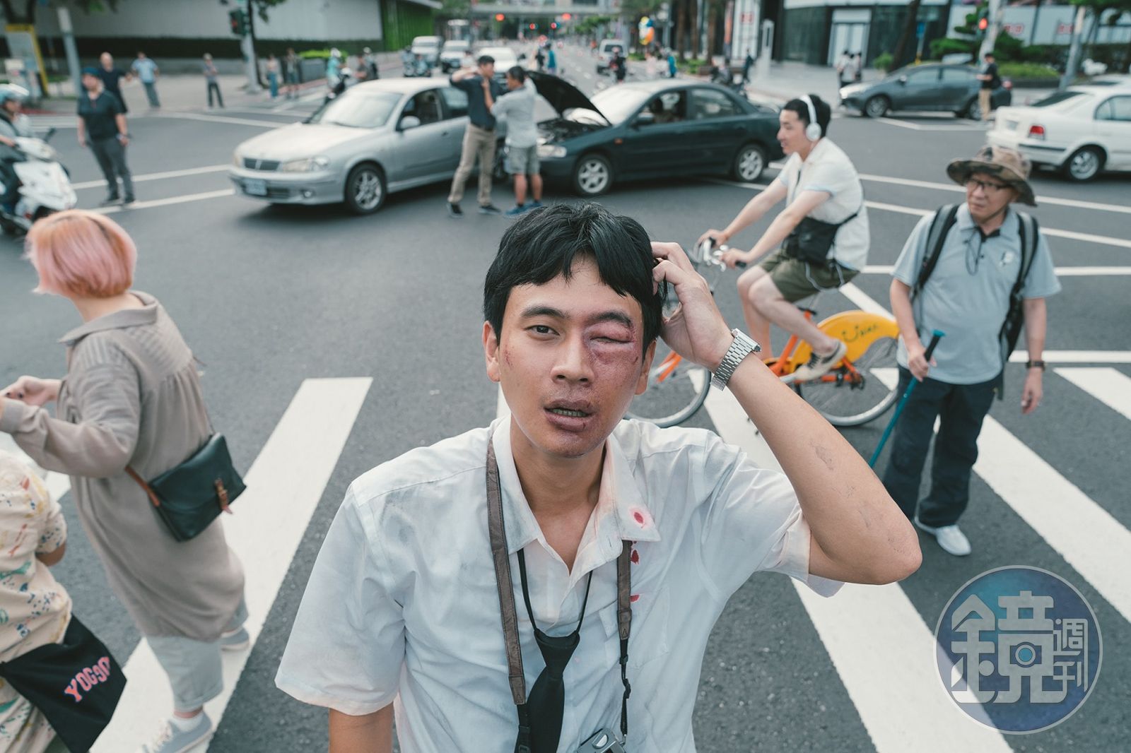 場景選在車多人多的信義區。時間從凌晨4點到下午1點,一路從松智路到松壽路封街6線道,動員將近上百位工作人員,臨時演員也找了近百名,出動4、50台車,更出動空拍機拍攝,要讓觀眾在這一幕感受《消失的情人節》的魔幻時刻。現場所有的臨演都必須在導演喊Action時定住不動,只有劉冠廷可以自由來去,他直呼:「好像大型的整人節目喔!」這場戲一拍完,工作人員必須將現場復原,此時劉冠廷看大家忙著清理,也跟著幫忙搬運物品。