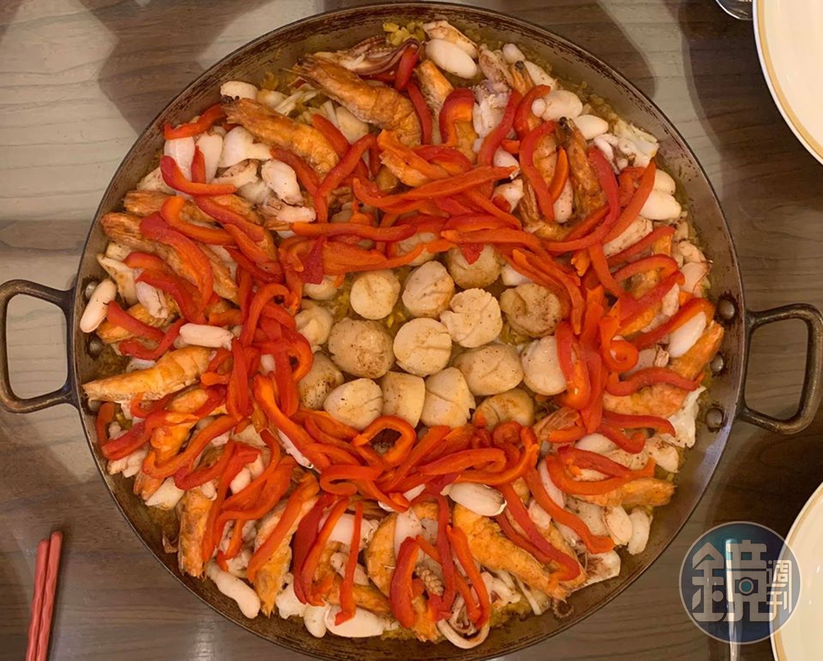 Step11:關火。直接將Paella Pan熱鍋上桌,用鏟子從鍋沿至鍋心,起出海鮮飯到盤中,多取一些自己喜歡的海鮮。好吃到爆!