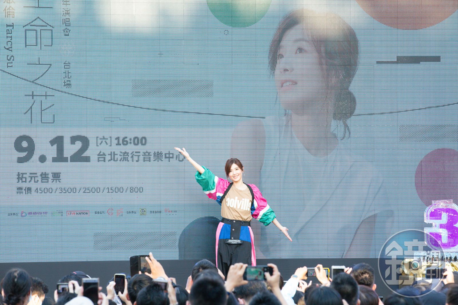 提及演唱會進度,她不知是因壓力大或是天氣太熱,睡得比較少,希望能改善睡眠品質,獲得一夜好眠,目前對舞台造型有點傷腦筋。