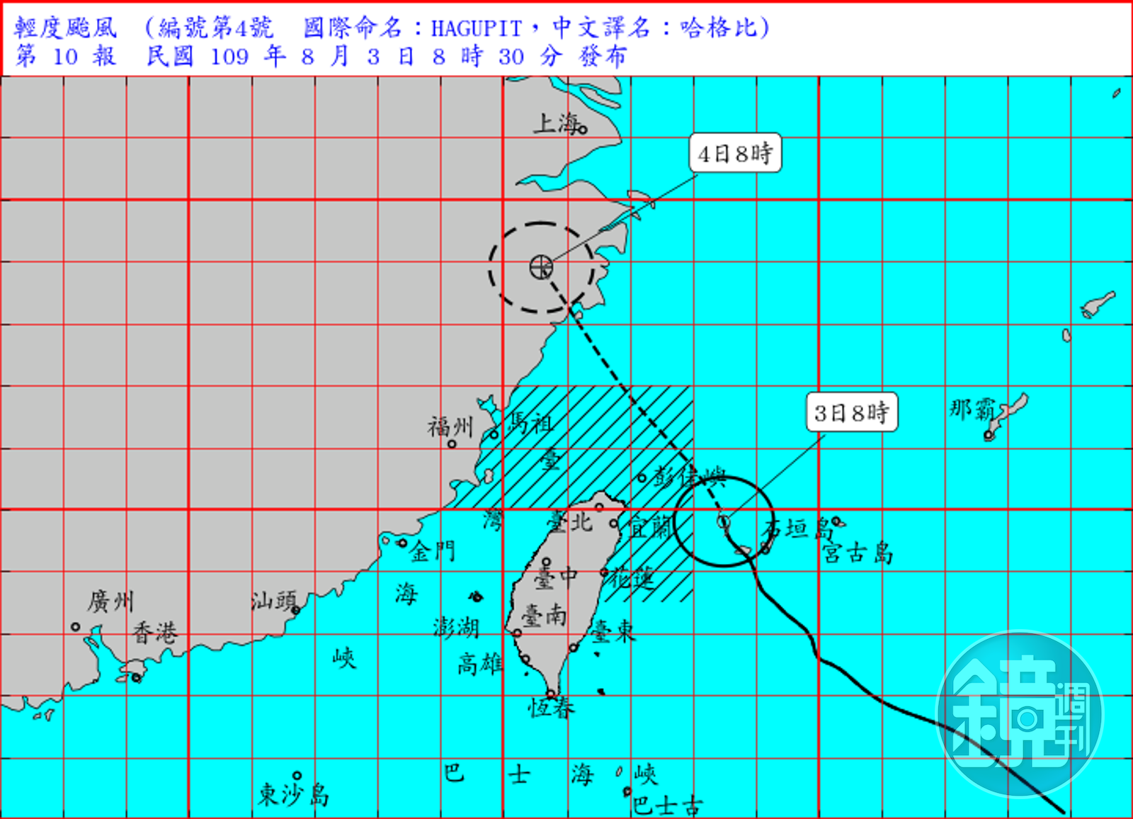 中央氣象局今日上午8時30分發布哈格比的海上颱風警報第10報,據最新氣象資料顯示,目前在宜蘭東方海面,向北北西移動,其暴風圈已進入臺灣東北部海面及北部海面並構成威脅。預計此颱風強度仍有稍增強的趨勢。哈格比預測明(4日)8時的中心位置在馬祖的北北東方約310公里之海面上。