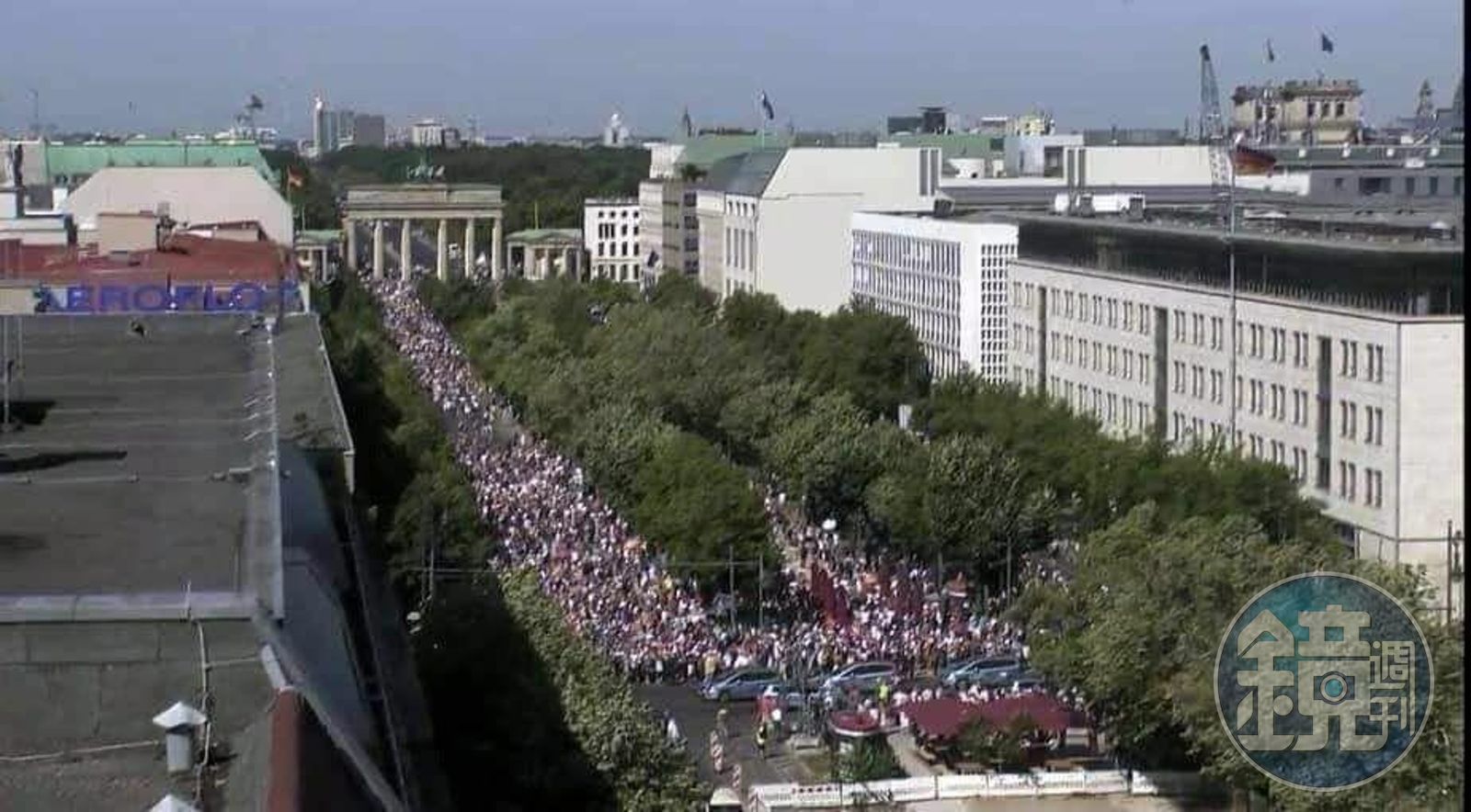 根據外媒綜合報導指出,1日在德國柏林的街頭上,有約1.7萬人上街抗議德國政府的口罩政策,大批民眾聚集在布蘭登堡大門(Brandenburg Gate),指控政府侵害了他們的權利與自由。