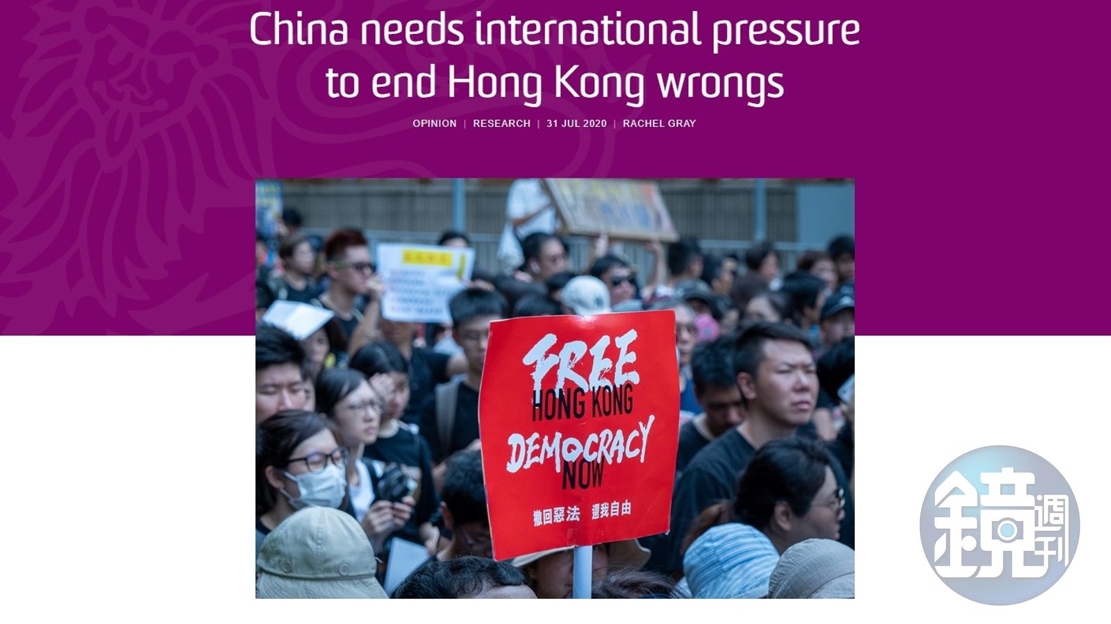香港在被中共強推「港版國安法」後,在國際地位上開始出現轉變,許多國家撤銷對香港的特殊待遇,甚至取消與香港的引渡條款,被視為世界各國在對中國進行反制,澳洲的新南威爾斯大學中,有名身兼NGO「人權觀察」(Human Rights Watch)澳洲分部主任的法律系講師伊蓮皮爾森(Elaine Pearson),日前在公開文章中指出,「港版國安法」威脅到香港的一國兩制,呼籲各國透過制裁的壓力,終結中國對香港所犯下的錯誤。