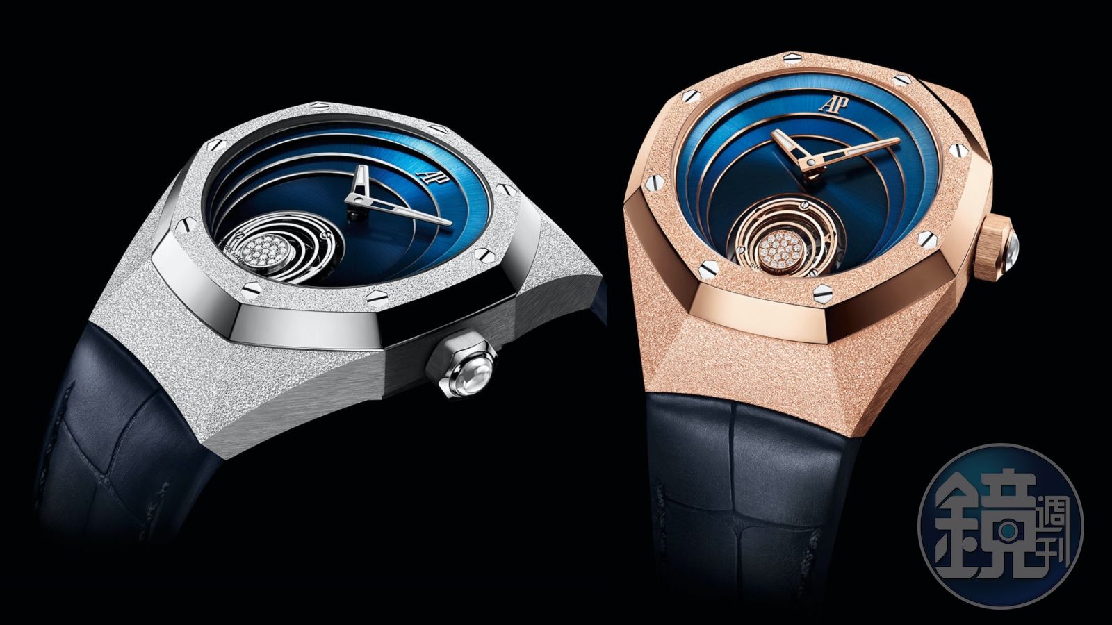 愛彼的產品中只要是複雜功能的機芯,向來都是出自旗下機芯研發廠APRP(Audemars Piguet Renaud et Papi)之手,這次搭載的手上鍊機芯2964自然也不例外。錶款有18K白金和玫瑰金兩種材質,面盤上立體圓弧的倒角切面、Logo還有指針,以及陀飛輪框架,也都會對應到和錶殼同樣的材質,做出成套的搭配,細節都顧慮得很周全。