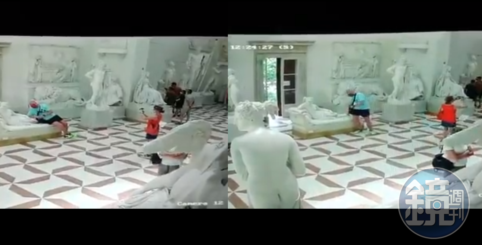 館方報警並調閱監視器,發現有名穿著藍綠色運動上衣、黑短褲的男子,模仿雕像動作斜臥,手肘靠在雕像小腿處,不遠處有名年紀相仿的紅衣女子替他拍照。男子起身後似乎發現雕像腳趾有異,但並未通知館方,裝作若無其事地離開。幸好博物館為了配合防疫,所有訪客都有登記,警方循線找到坐斷雕像的男子及他的配偶。