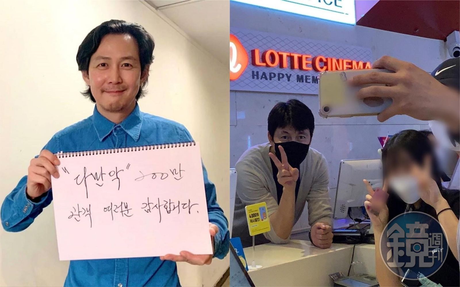 李政宰主演的《魔鬼對決》在韓國觀影人次破200萬,他特地寫下感謝的話給影迷;他的好友鄭雨盛上週末跑到影城賣票宣傳《鋼鐵雨:深潛行動》。(左圖翻攝CJ Entertainment Instagram,右圖翻攝LOTTE Entertainment Instagram)發布時間:2020.08.10 15:27 臺北時間