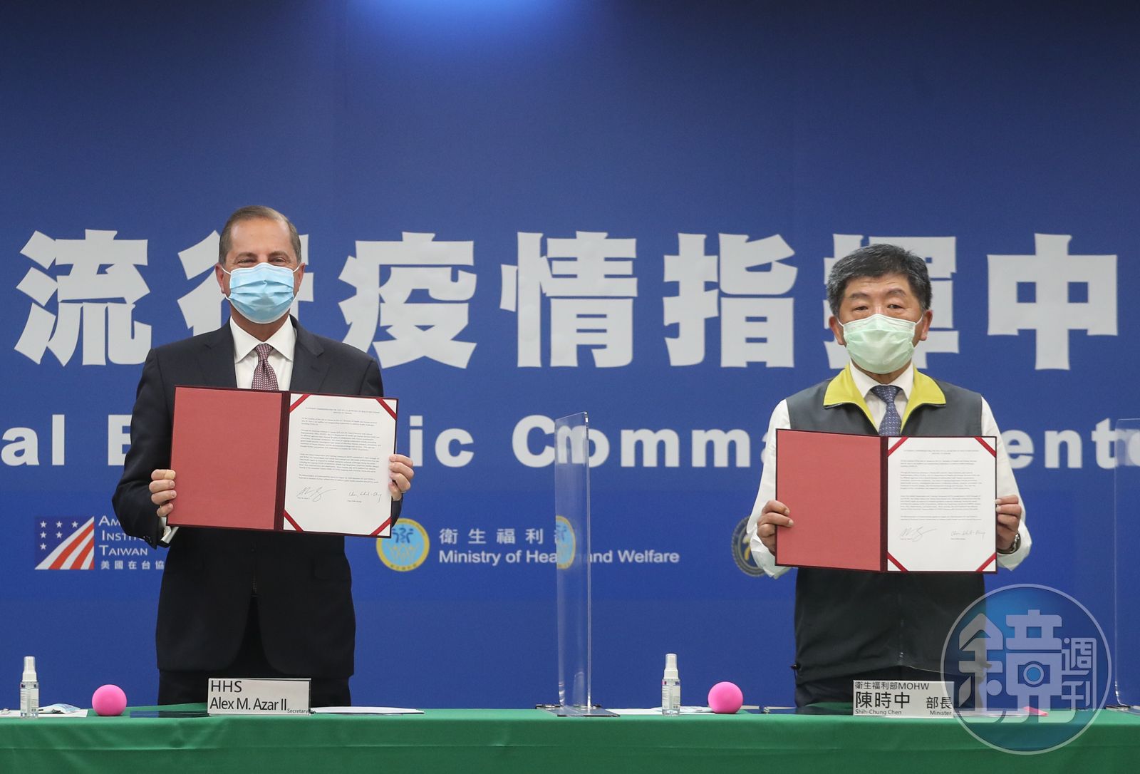 在美國衛生部長阿札爾和衛福部長陳時中的見證下,台美昨日正式簽署衛生合作備忘錄。(中央社提供)發布時間:2020.08.11 17:22 臺北時間