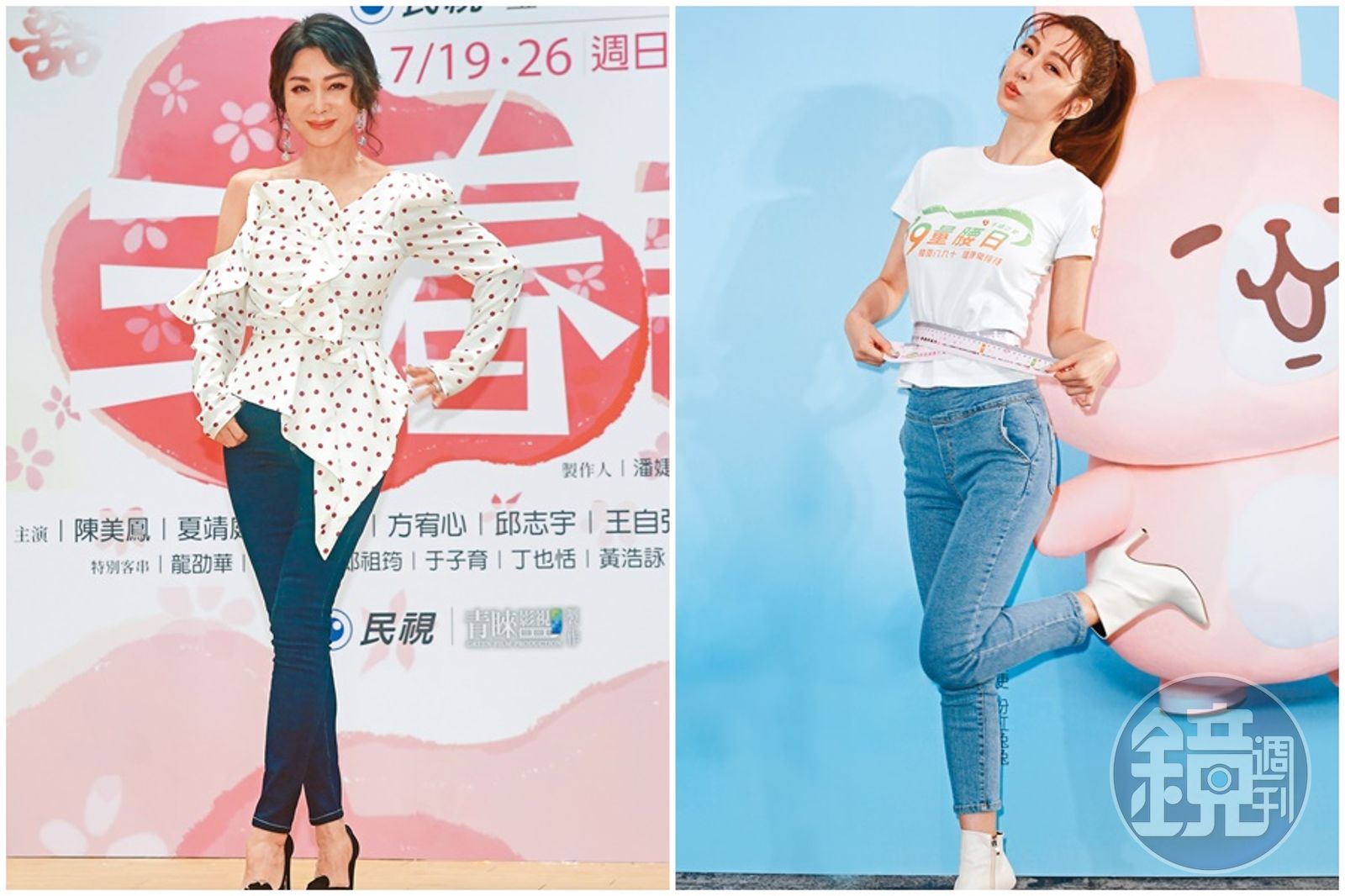 「最美歐巴桑」陳美鳳(左)、台劇女神曾莞婷(右)示範逆天長腿「疊」之術,雙腳交疊讓腿看起來纖細、修長。發布時間:2020.08.15 05:58 臺北時間
