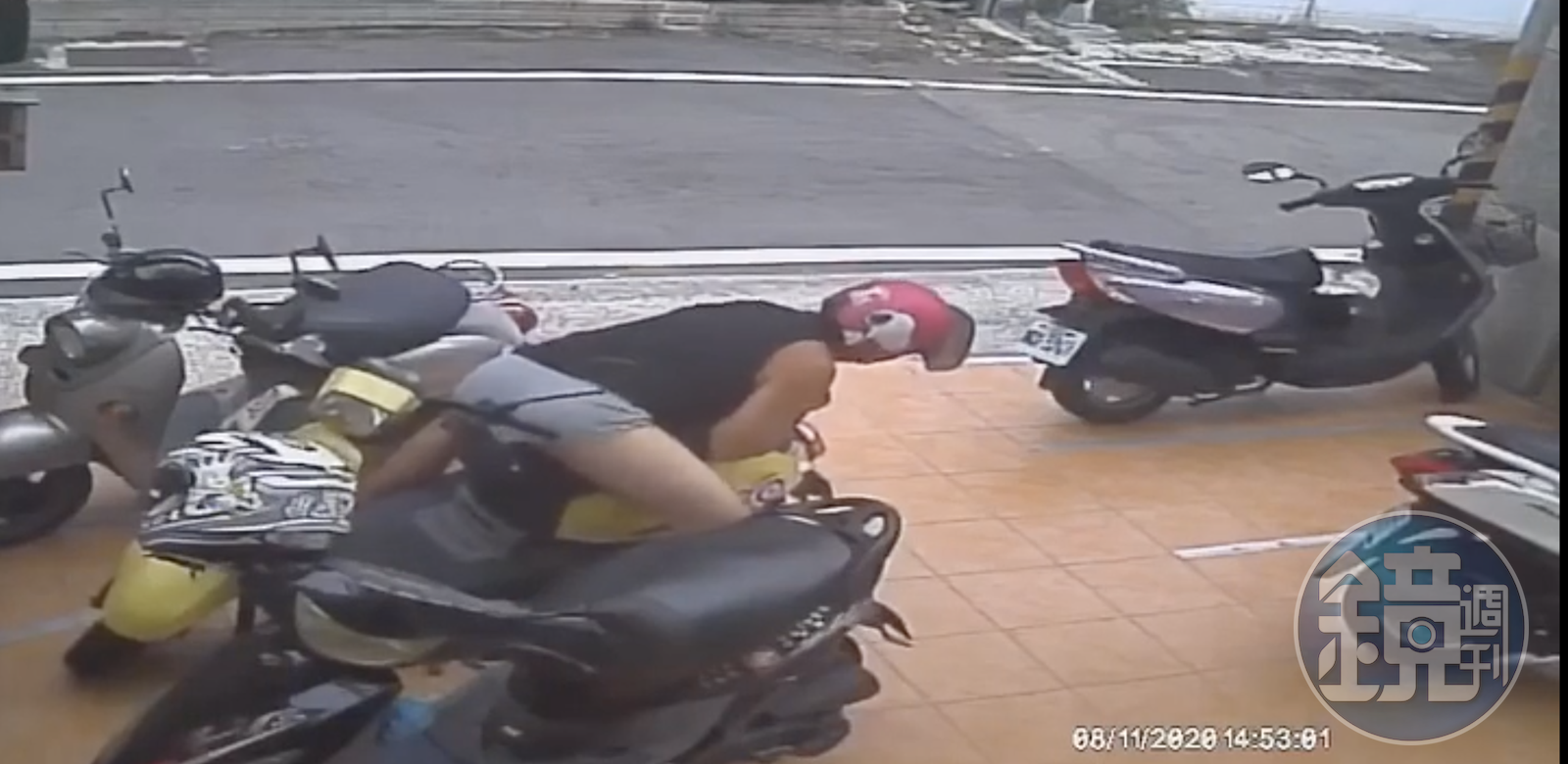 男子當街脫褲用下體磨蹭機車,還戴上女車主的安全帽。(翻攝自「我是頭份人」臉書社團)發布時間:2020.08.12 13:07 臺北時間