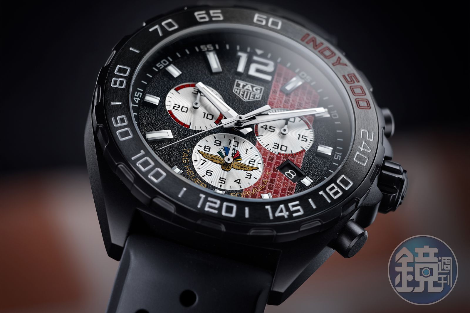 此外,關於Indy 500的特徵還有陶瓷錶圈上測速儀的字樣,以及6點鐘位置小錶盤的Indy 500 Logo,在後底蓋上同樣有Logo裝飾。橡膠錶帶配上穿孔設計加強了呈現運動感與賽車風格。43mm精鋼錶殼經DLC處理,防水規格為200米,裝載石英機芯,限量1,500只,定價NT$69,000。