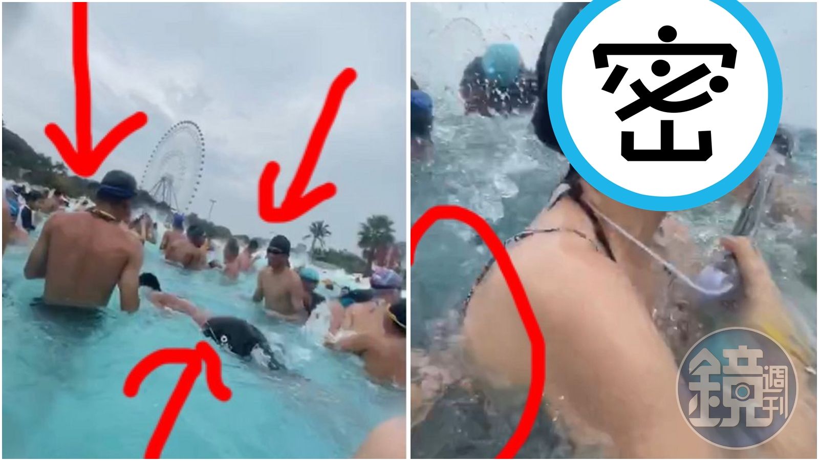 沒幾天後,女網友B也在事發過後整理照片時偶然發現一則疑似拍到遭性騷擾過程的影片,B女指出該影片是上月30日友人在錄人工海嘯時偶然錄到的畫面,當時大海嘯滅頂,有人很大力的扯了她的比基尼綁帶和外面小背心肩帶,當海嘯退去後,轉頭卻沒有看到人。