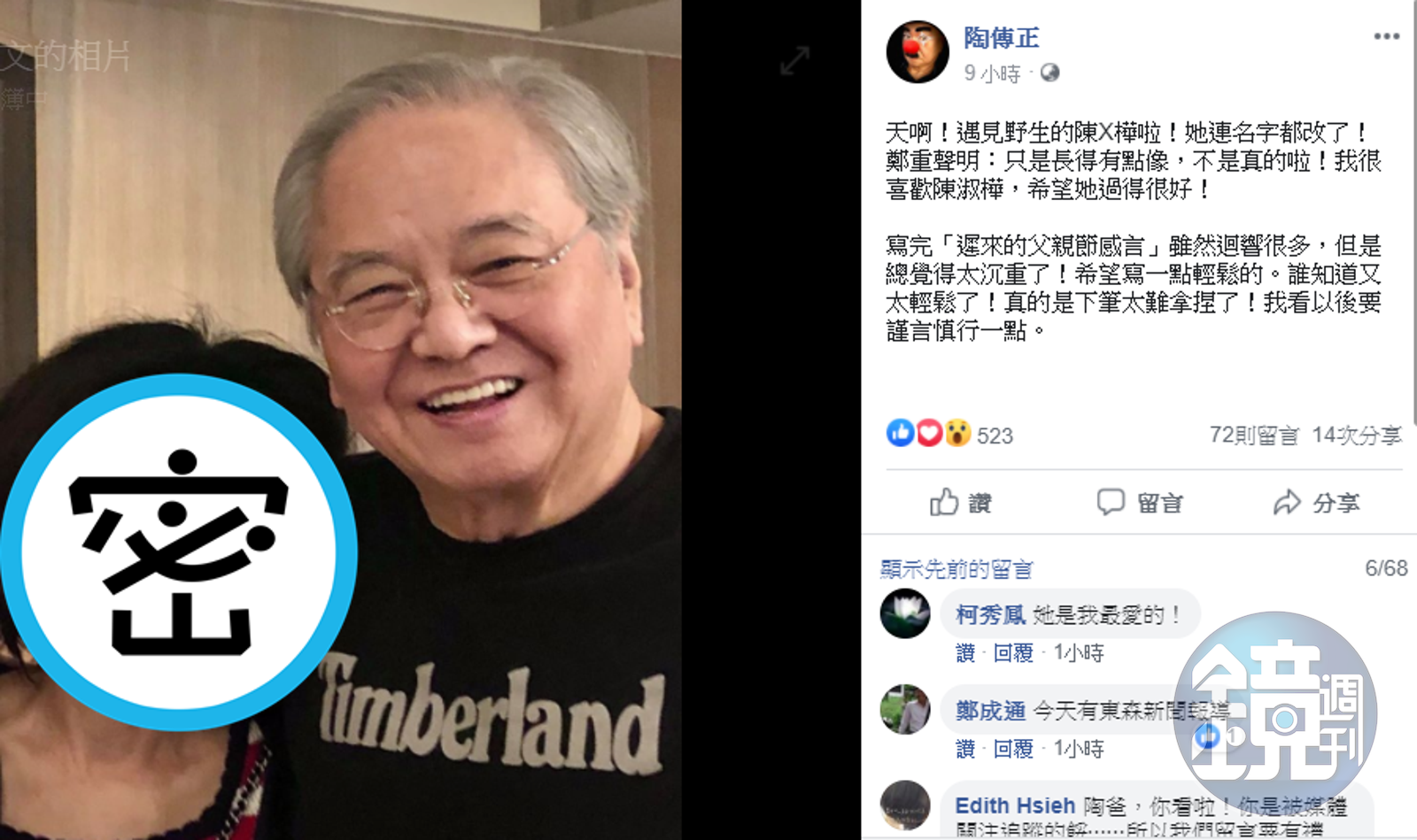 陶爸寫道「天啊!遇見野生的陳淑樺啦!她連名字都改了!」還附上自己和一位短髮女子的合照,神色表情都和陳淑樺相當神似,引來網友紛紛留言「看她笑容可掬,希望一切平安」「好久不見的偶像」。不過陶爸馬上又在下方寫說「鄭重聲明:只是長得有點像,不是真的啦!我很喜歡陳淑樺,希望她過得很好!」表示只是在路上遇到和陳淑樺很像的人。