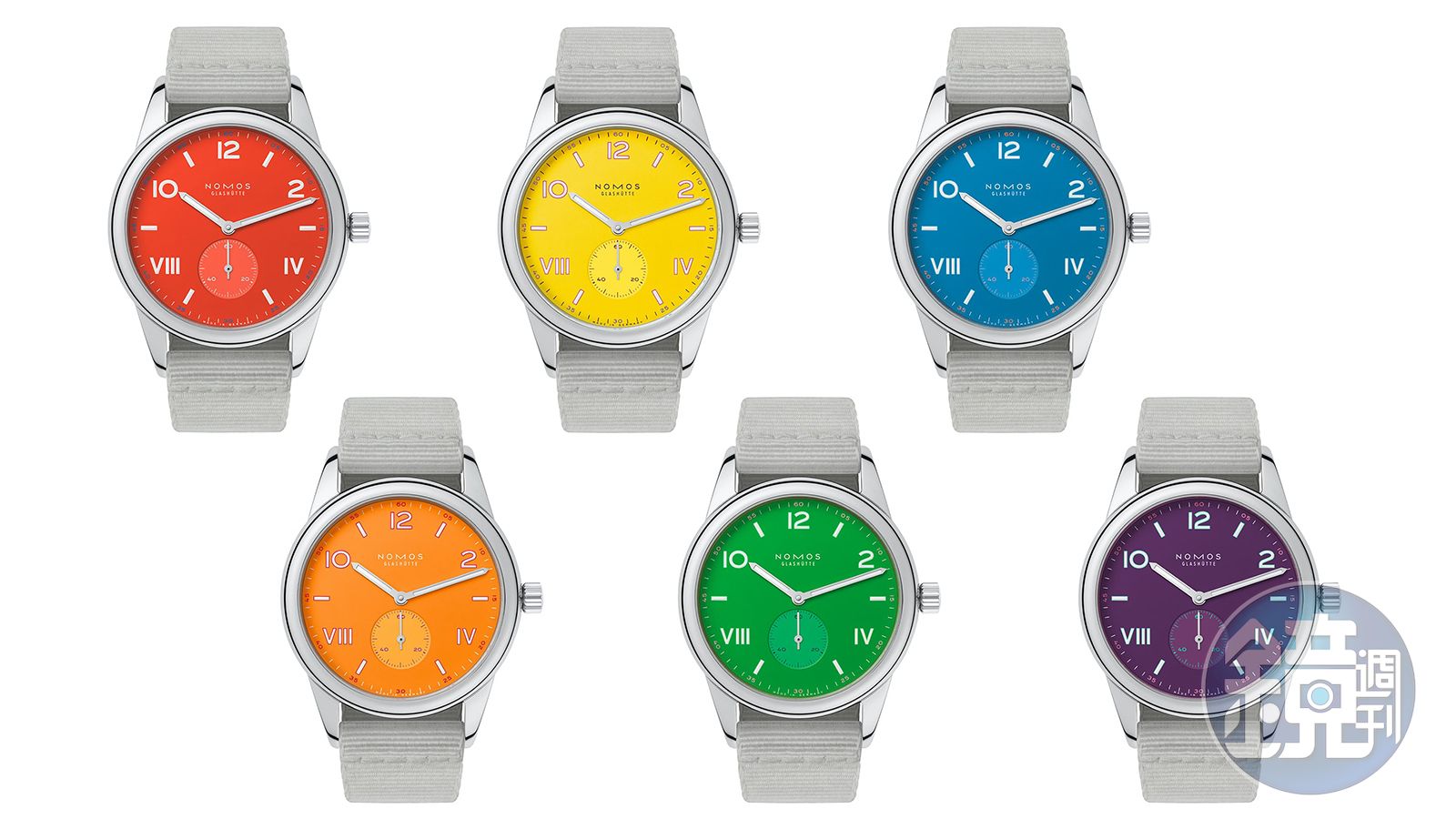 儘管簡單、清楚、帶有細節的視覺設計是NOMOS的主力,但玩起顏色來NOMOS也是滿大膽的,很常會突然出現可以對應出一整排Pantone色票的面盤,之前的Tetra就出過莫蘭迪色調,而這次的Club Campus 38 for Pride雖然乍看之下只是單色面盤的改款,但六只錶擺在一起看的時候就像湊齊所有線索那樣浮出通關密碼,彩虹的顏色,愛最大!