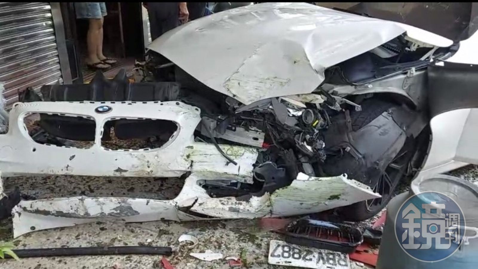 附近民眾聽到衝撞聲音,跑出來看,只見BMW停在距民宅鐵門不到一公尺處,車頭嚴重毀損,連保險桿都掉落,車牌噴飛,停在一旁的機車也被撞倒、撞爛,就連騎樓的水龍頭也被撞斷,水流不止,現場一片狼籍。