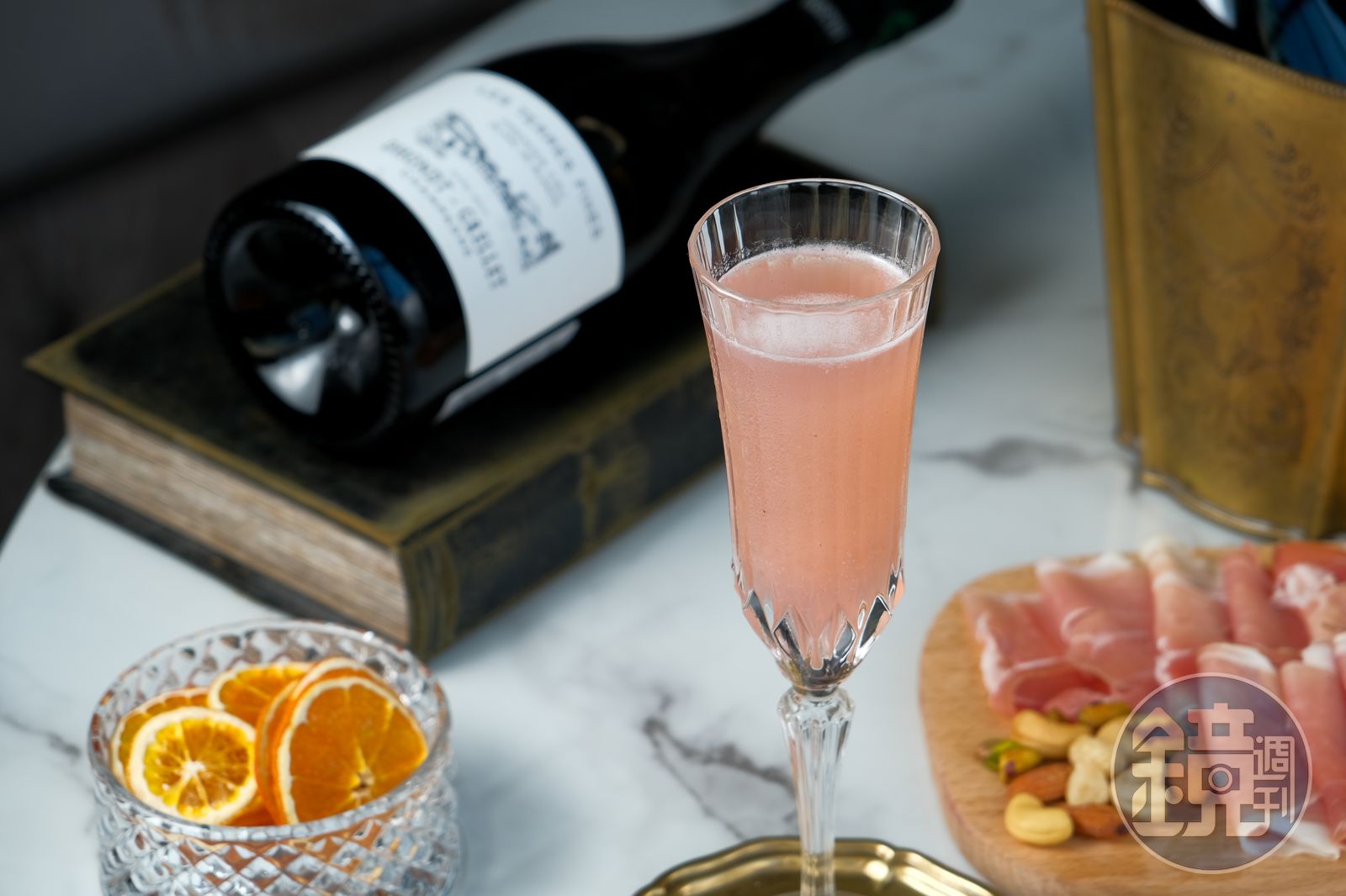為了讓香檳更加平易近人,這裡會視House香檳酒款數量及風味選用來調製香檳調酒,老法香檳融合龍舌蘭、義大利苦甜酒,做出「Bitter Sweet Emotion」調酒,酸甜微苦,迸出葡萄柚風味,「老法香檳厚實,帶有一點奶油香,正好補上果香所缺乏的厚度。」調酒師蘇懷信(Victor)說。