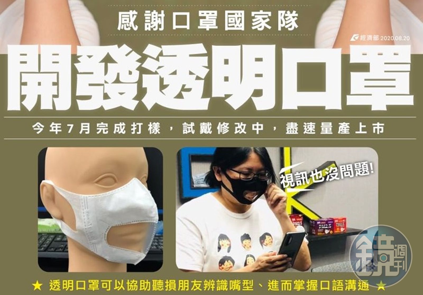 經濟部表示,在收到蒲公英聽語協會有「透明口罩」的需求後,經濟部工業局找了紡織產業綜合研究所、台灣康匠及權和機械,嘗試開發具有防霧膜的透明口罩,既能遮住口鼻達到防疫效果,又能看出表情協助聽障人士溝通。