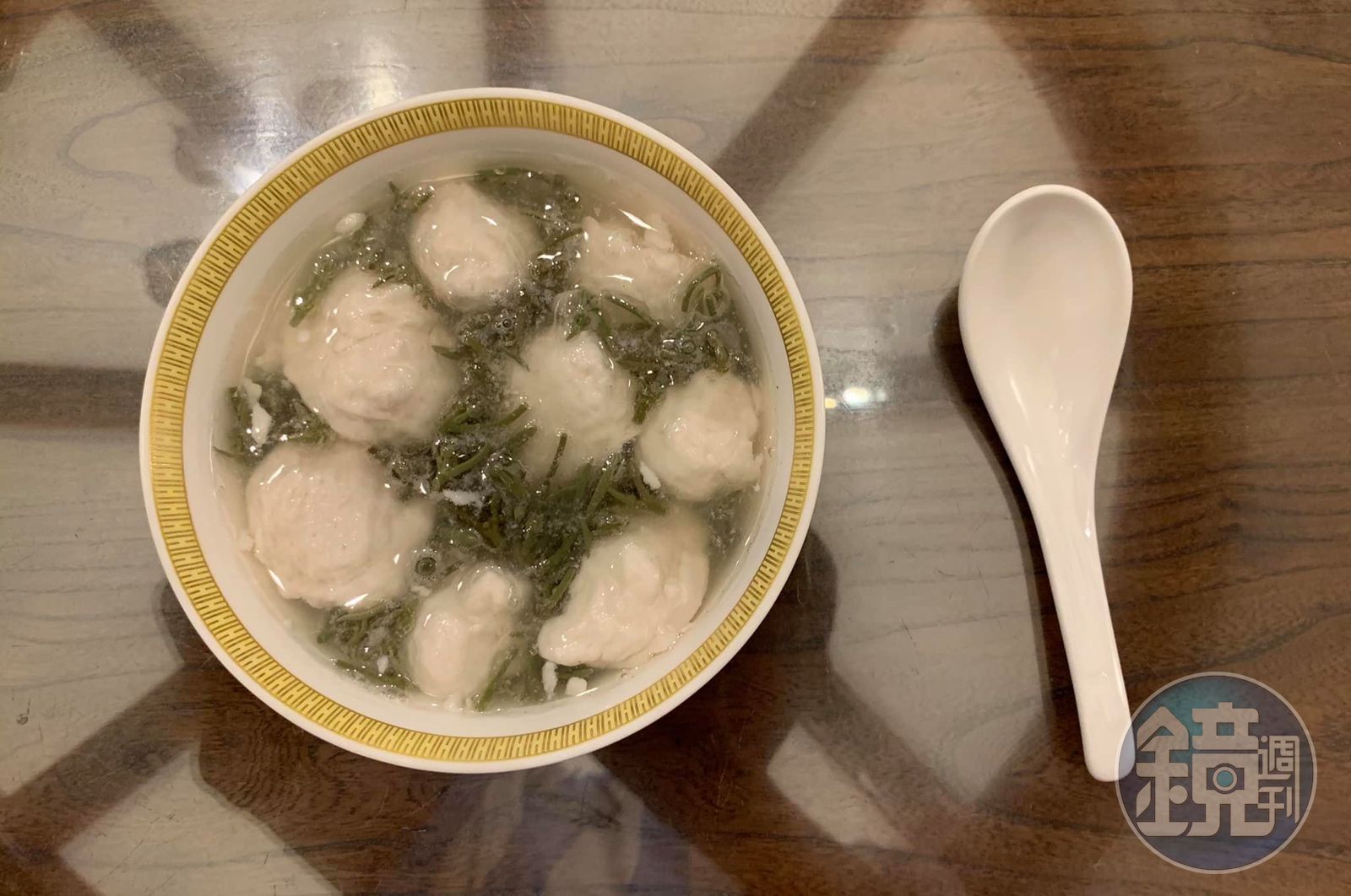 原來煮魚丸的這鍋水直接加入雞高湯,加椒鹽調味後,放入用開水燙過的蒓菜(它被保存在醋水裡,一定要用開水燙過去酸才用)。大滾後,裝碗上桌。細啜如豆腐般綿嫩的杭州魚丸,鮮滑溜口的蒓菜。就算不附會蓴鱸之思,也絕對滿足您的腸胃。