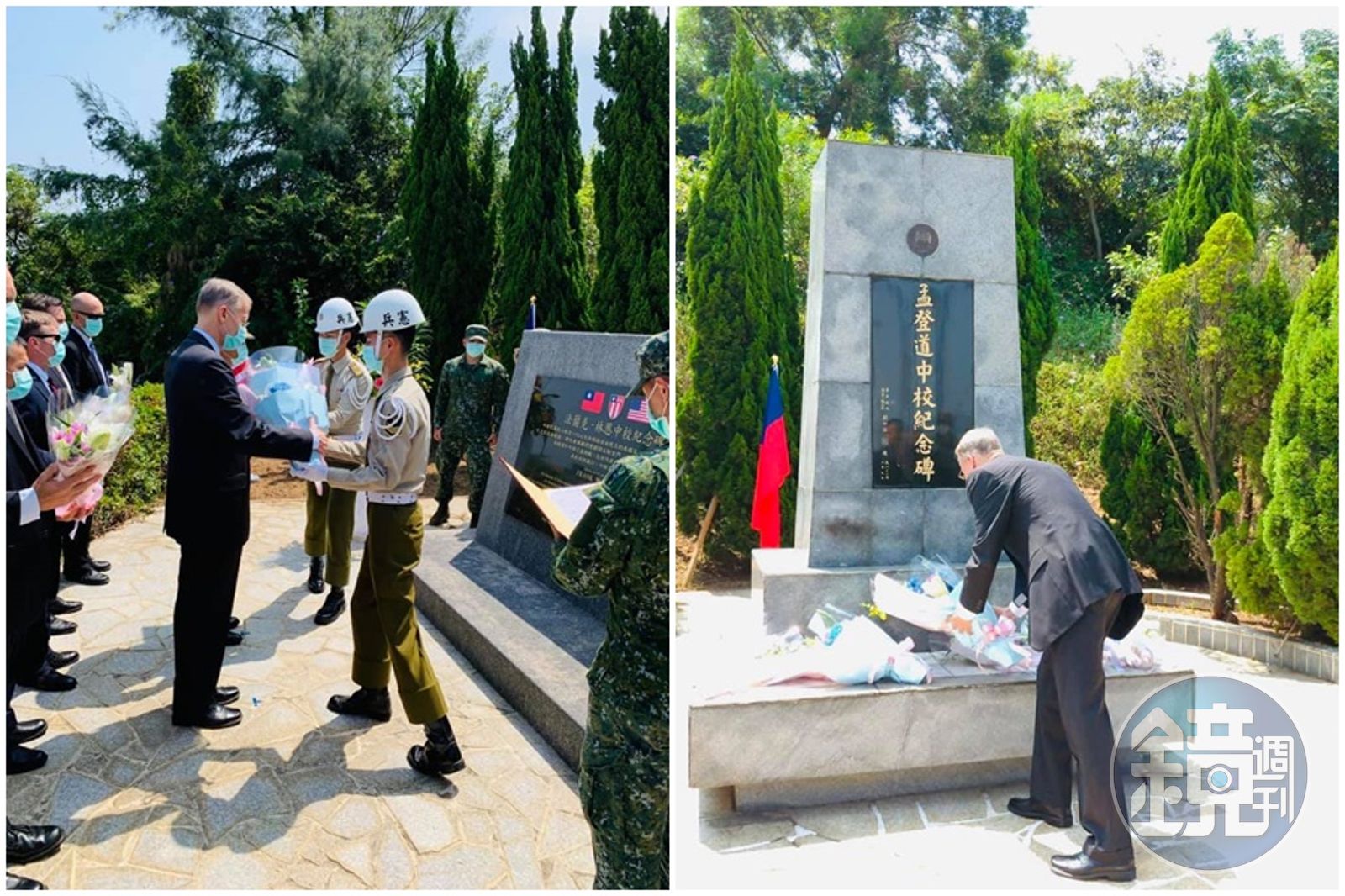 美國在台協會處長酈英傑在八二三砲戰紀念日當天前往金門,到兩位美國軍官孟登道中校和法蘭克林恩中校的紀念碑前獻花致意。(翻攝自美國在台協會臉書)發布時間:2020.08.23 16:38 臺北時間