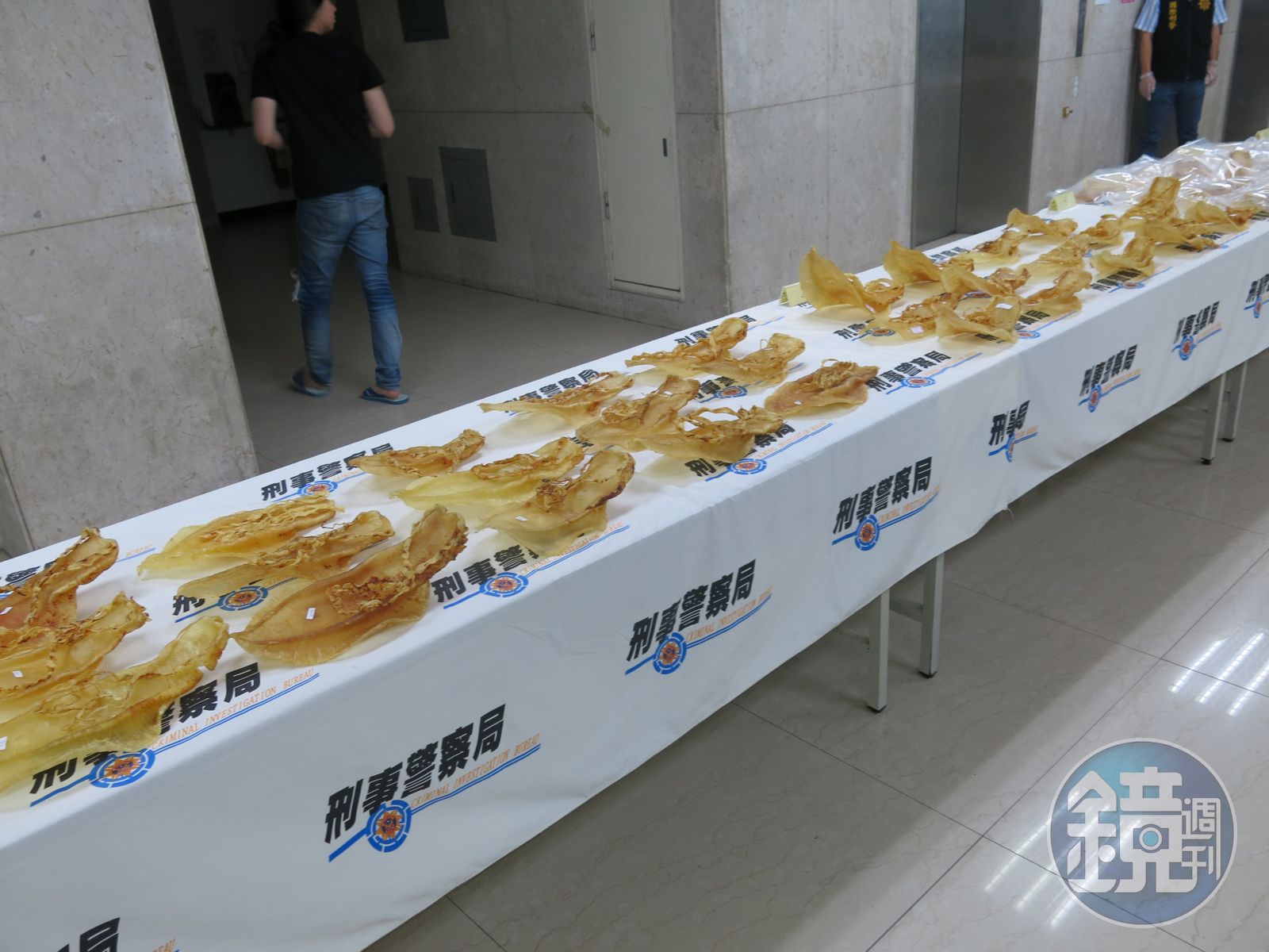 8月中旬,刑事局國際科會同財政部關務署台北關,多次於邊境攔阻、查扣143枚「加利福尼亞灣石首魚」乾魚鰾,另與台北市松山分局、新北市新店分局,兵分多路在新北市板橋、新莊、永和等地區,查獲涉嫌走私的姚姓主嫌到案,再查扣成功闖關的18枚「漏網之魚」,共計查扣161枚、重逾19公斤之「黃花膠」,經台、美兩地實驗室進行檢驗,確認其為瀕臨絕種的「加利福尼亞灣石首魚」魚鰾。