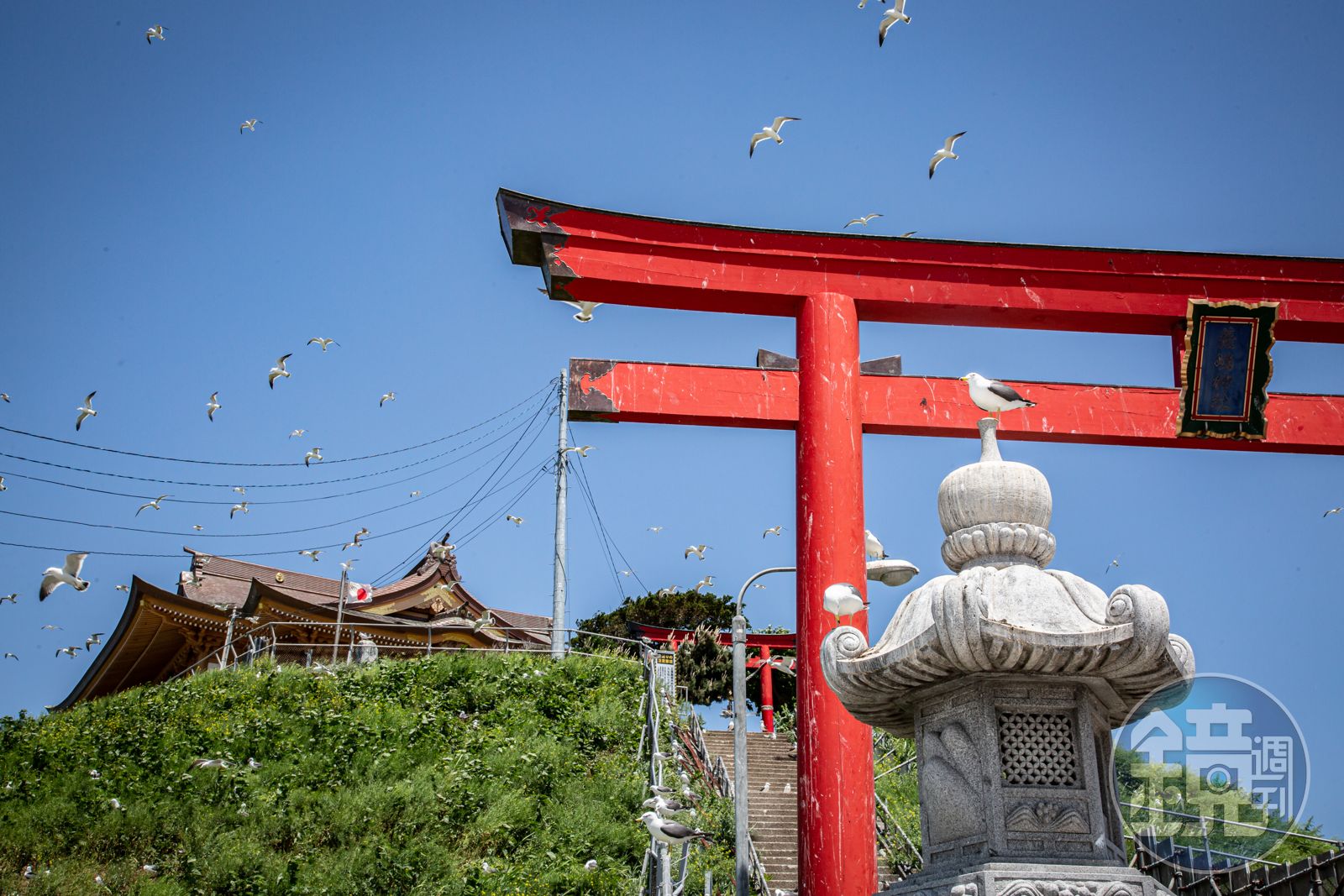 下車後,放眼望去沒有一個地方沒有海貓!地上有、旁邊的小山丘上有、神社的鳥居上當然也有,在天空中盤旋的更是數不清數量。不過海貓似乎沒有很怕人,可以以一定程度的近距離,看看牠們的模樣,但因為是產卵季節,海貓們會護著自己的巢,所以還是保持適當的距離才不會打擾到牠們。