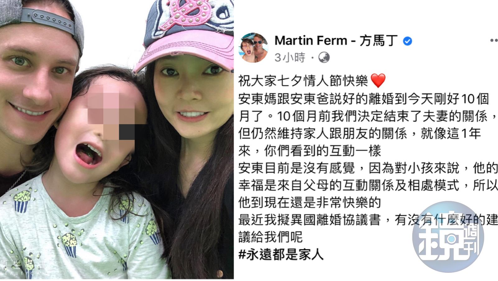 馬丁在臉書上先是祝福粉絲們「七夕情人節快樂」,接著卻自爆已經與老婆離婚10個月,但他強調兩人仍維持家人與朋友的關係。馬丁透露兒子安東對於父母離婚暫時沒有什麼特別的感覺,「他的幸福是來自父母的互動關係及相處模式,所以他到現在還是非常快樂的。」
