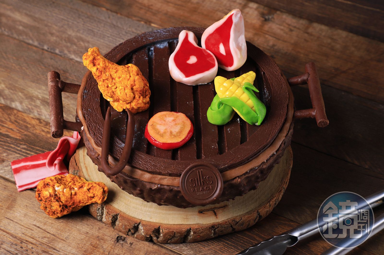 台南晶英的法籍西點行政主廚羅倫,以齊聚烤肉為發想,打造迷你版「BBQ造型蛋糕」,烤盤造型以巧克力外殼,包覆鬆軟榛果巧克力海綿蛋糕和脆片果仁糖製作,入口透出微苦黑巧克力,與牛奶巧克力慕斯的甜味,尾韻則有淡淡的煙燻香氣,抓住眼球視線的還有,用翻糖製作的Q版雞腿、玉米,可愛到不行!