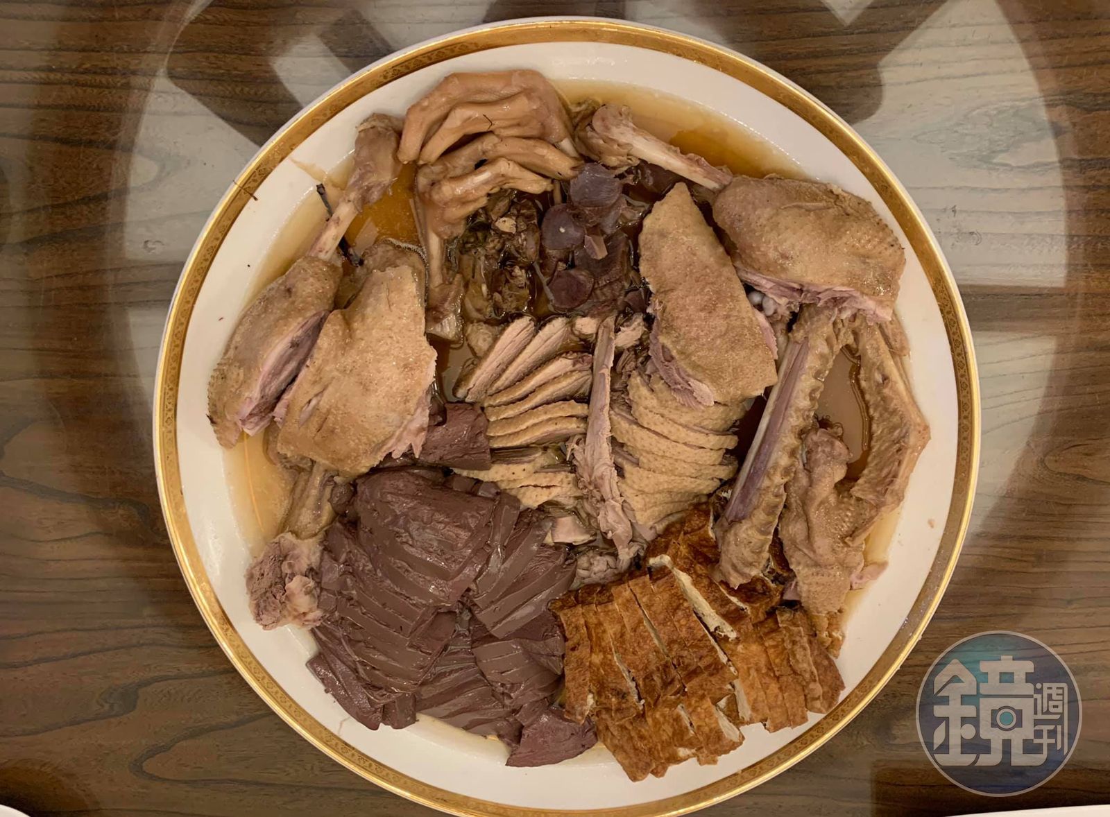 Step12:鵝血切薄片放鵝肉上方一側,豆腐切薄片放另一側。淋上原鍋滷水。上桌。