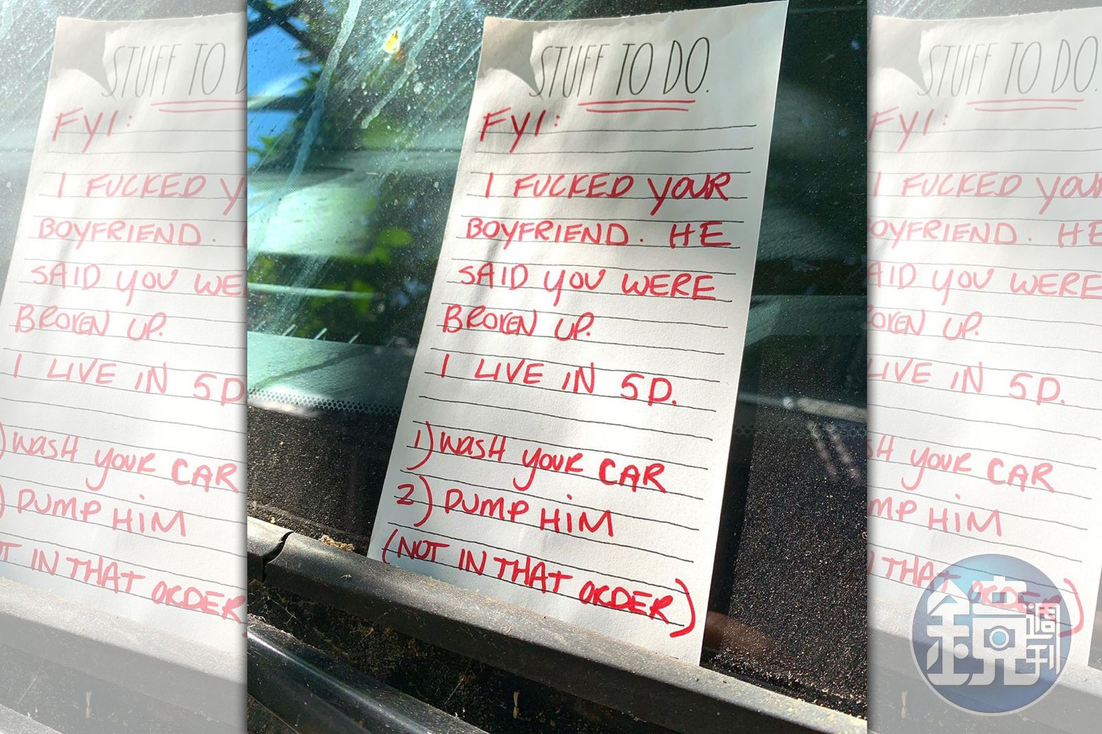 投稿者某天在車窗上發現1張用雨刷夾著的紙條,紅色馬克筆大大寫著「待辦清單」,寫紙條的人首先自首:「我跟你男友睡了。他說你們分手了。」寫紙條的人說自己住在5D,應該和投稿者住在同一個公寓或同一個社區,2人是鄰居。