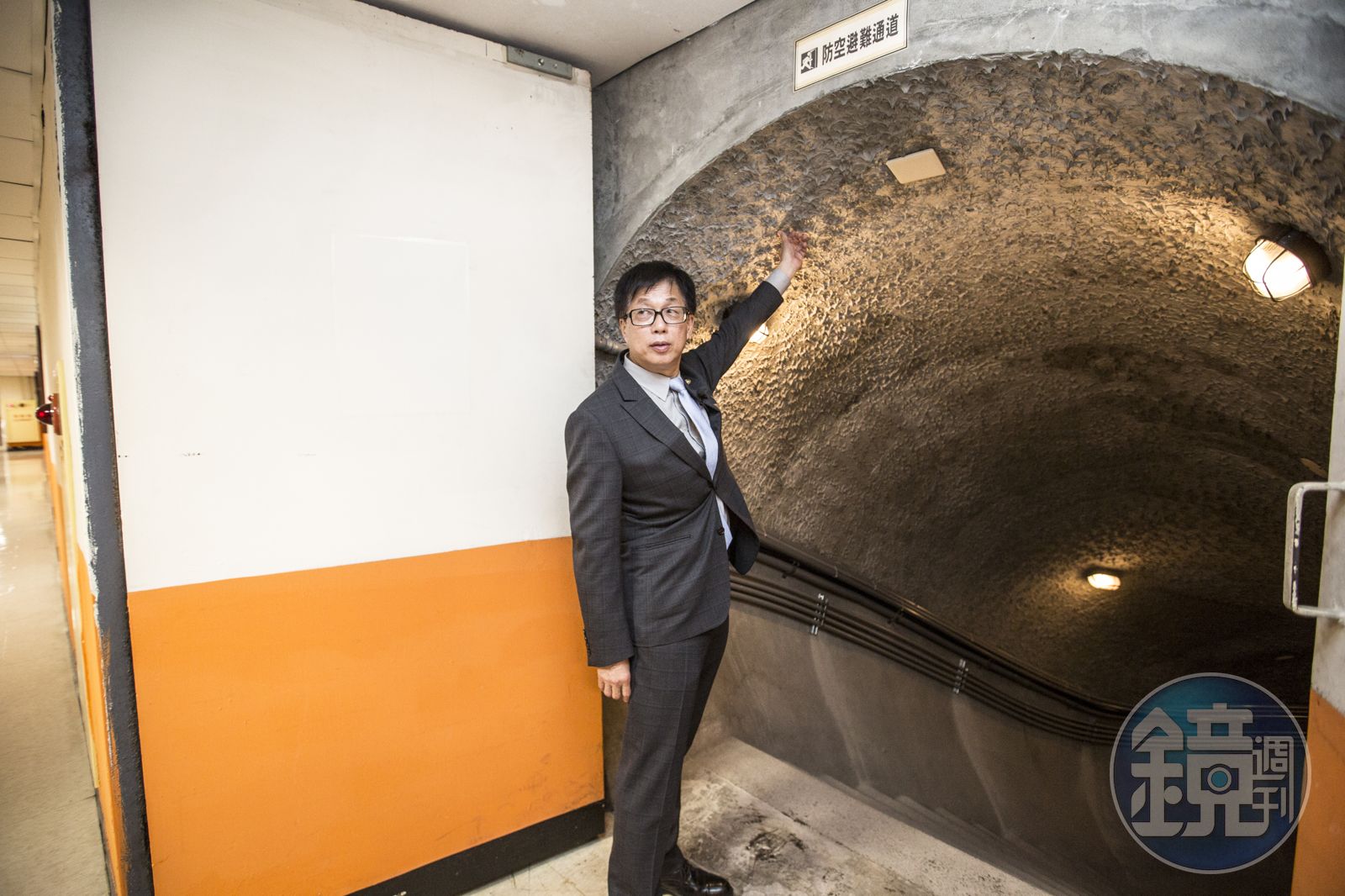 「這一條通道是通往哪裡呢,盡頭出去是一個很有味道的文化場址,是以前日本時代神宮的所在,還有孔二小姐的故居、小花園、防空洞,……」圓山飯店董事長林育生帶我們穿越人聲鼎沸的飯店大廳,走過空無一人的地下長廊,來到一處標示防空避難通道的暗門前;雙手一推,只見一條幽幽密道向下盤旋,彷彿穿越時空,重現權傾一時的蔣宋政權年代。