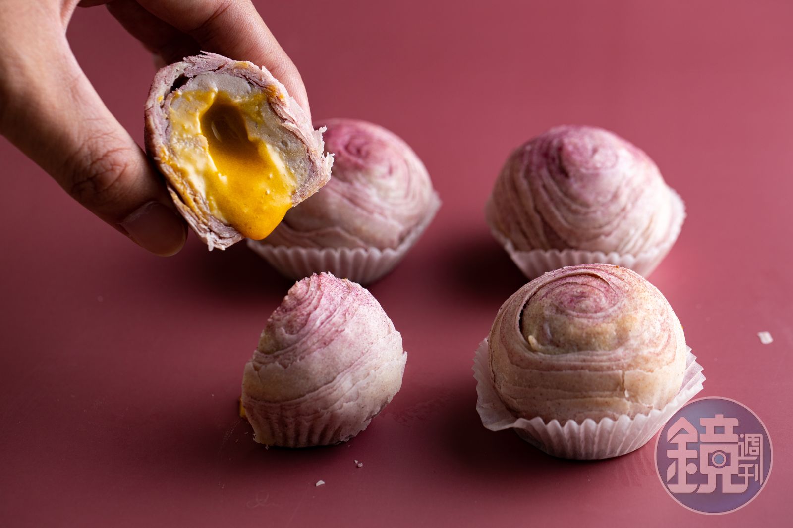 今年新推出的「流心芋頭酥」,以同樣拿到冠軍的芋頭酥做改良。層層堆疊、呈現螺紋狀的酥皮,摻進芋頭添色,內餡用芋泥包著調入奶油的鹹蛋黃,一口咬下會爆漿,嘗得到蛋黃餡的沙綿鹹味和芋泥的濃密甜香。