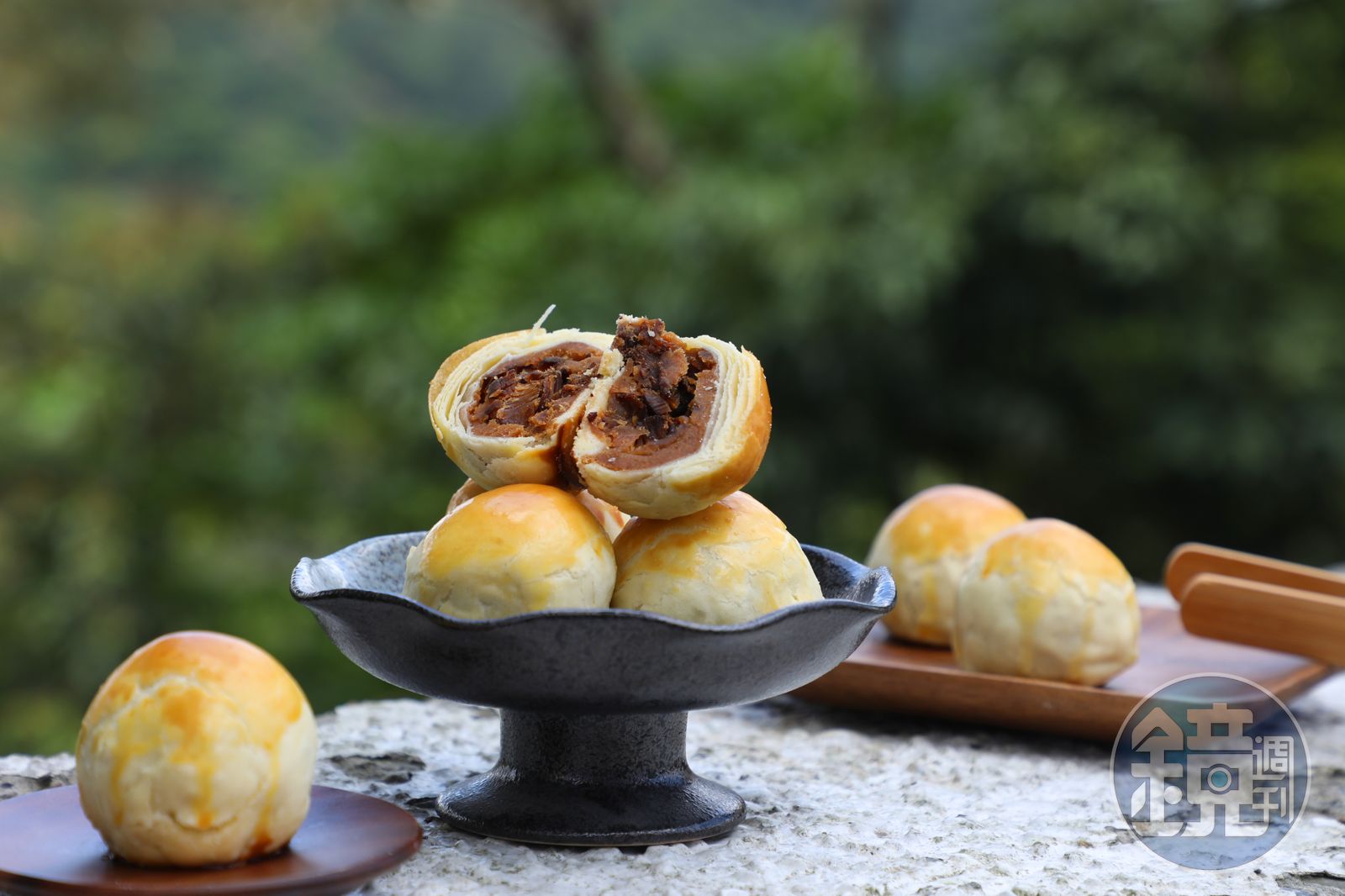 「烏豆沙蛋黃酥」以紅豆、奶油拌成內餡,口感甜綿,有鹹蛋黃調和甜味。(45元/個)深坑豆蓉肉塊酥