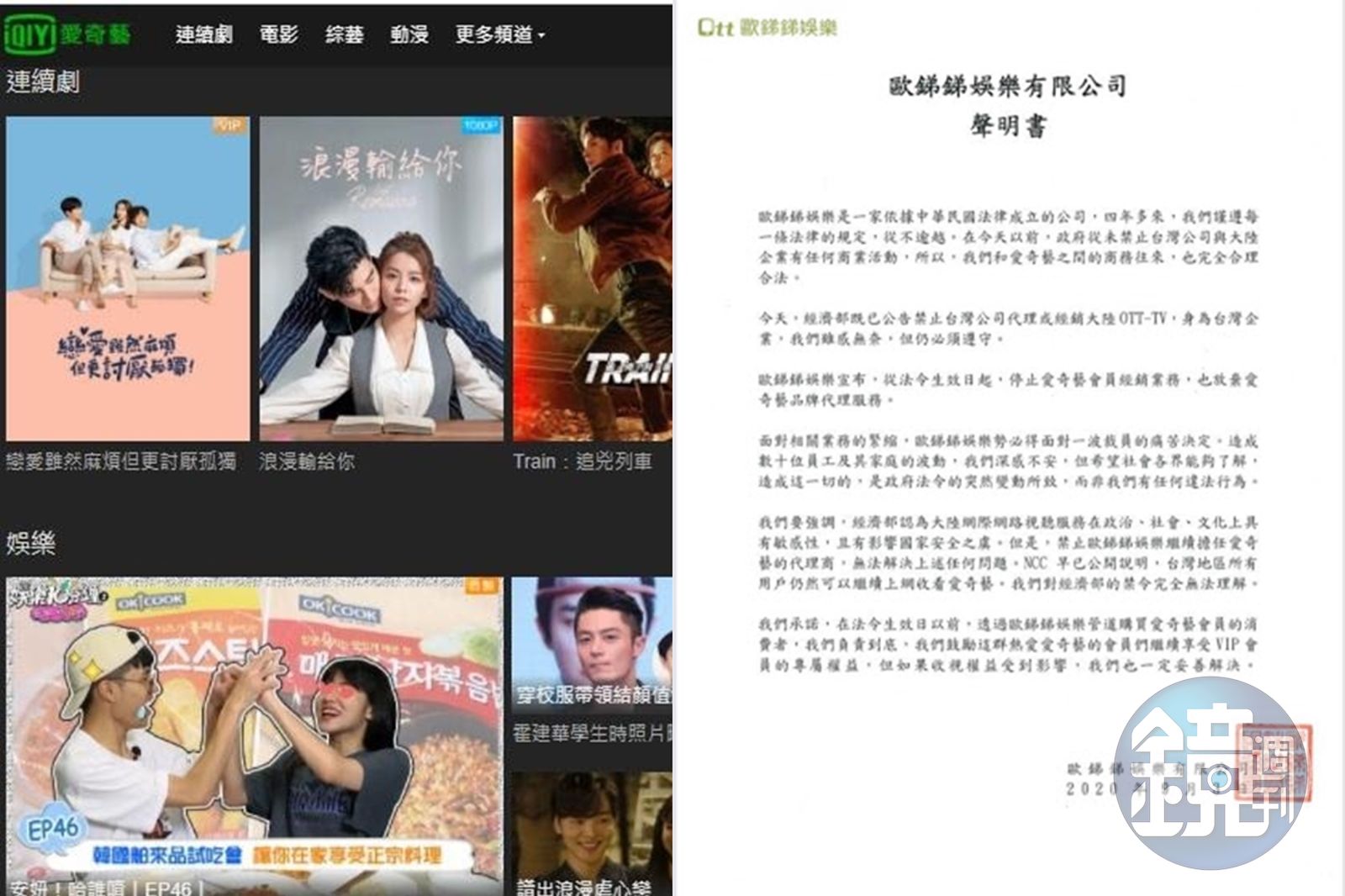 歐銻銻娛樂宣布,從法令生效日起,停止愛奇藝會員經銷業務,也放棄愛奇藝品牌代理服務。