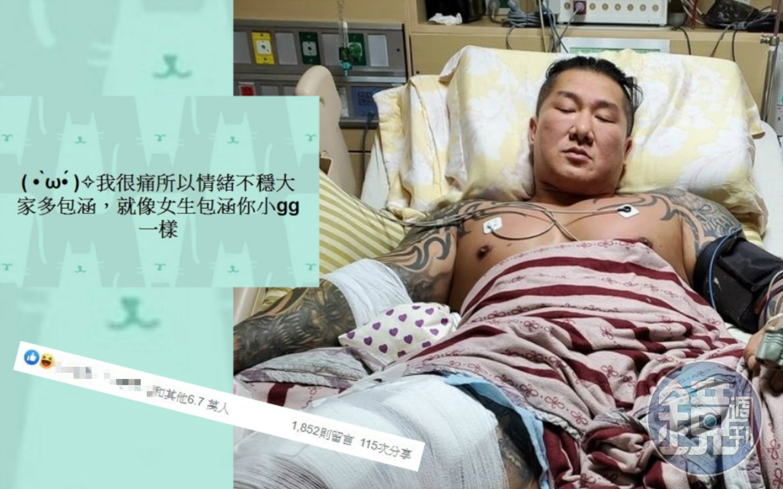 不過他又展現鐵漢柔情,再上臉書留言:「我很痛,所以情緒不穩,大家多包涵,就像女生包涵你小gg一樣。」立刻引來6.8萬個讚、近2,000個留言。
