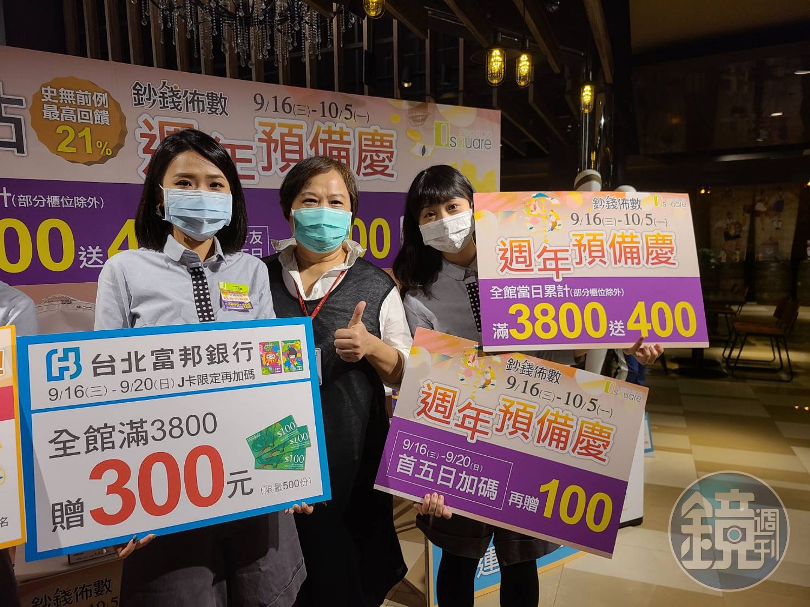 受到武肺疫情衝擊,京站上半年營收衰退約13%,隨著疫情趨緩、加上振興券助攻,7、8月業績已漸漸回溫,柯愫吟說:「年初業績辛苦,所以我們史無前例推出「鈔錢佈數週年預備慶」,只要在9月16日到10月5日期間,當日全館消費滿3,800即送400 元,卡友再送100元,搭配信用卡前5日再送300,回饋率高達21%,希望刺激買氣。」