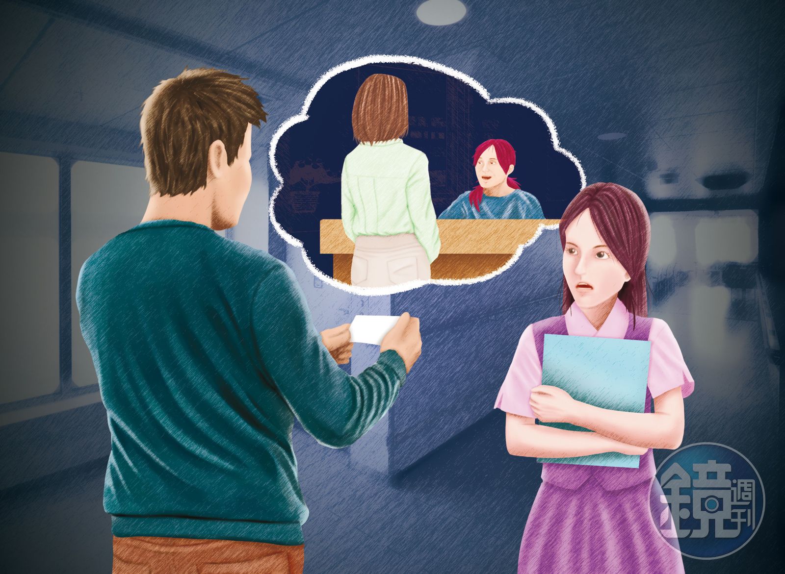 越靠近男人,簡曼婷越能聽到自己的心跳聲。她昨天嘴饞,跑到附近的超商買了一包餅乾,難不成這幾分鐘內出了差錯?簡曼婷拚命回想,返回教室時,學生們臉上的表情是否有異樣?不,她沒有印象了。那時接近8點,她的心思都在老三手背上的過敏是否好些了?要再預約回診時間嗎?若許老師的際遇發生在自己身上,賠錢事小,她恐懼的是丈夫一旦知情,很難不透露給公婆知道,想到那對夫婦嘮叨的事情又多了一樁,簡曼婷不由得握緊提袋,身軀僵直。