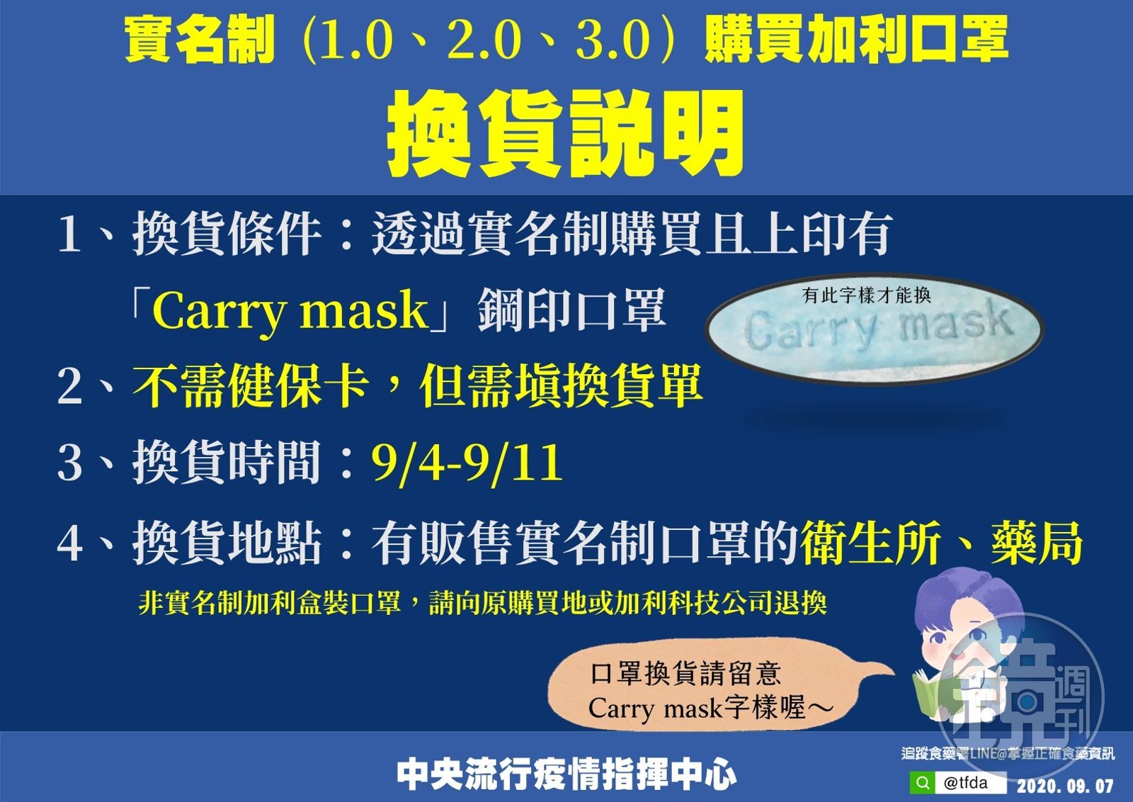 疫情指揮中心物資組組長蔡壽洤表示,民眾若透過實名制(包含1.0、2.0、3.0)購入印有「Carry mask」字樣的口罩,不需健保卡,在9月4日至11日期限內,前往販賣實名制口罩的衛生所及藥局,填寫換貨單便可進行換貨。