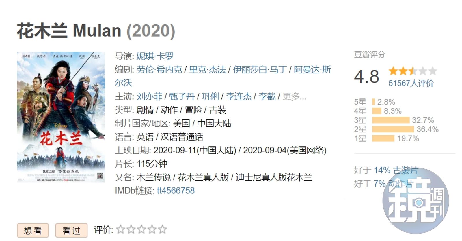 然而有人認為《花木蘭》主打的應該是中國市場,就算因反送中遭抵制又何妨?但網友發現,就連中國觀眾似乎也不買帳。雖然《花木蘭》要到11日才會正式在中國上映,但已經有許多人透過「其他」管道看過該片,在中國最大的電影評論網站「豆瓣」上,已有5萬多人給予評價,《花木蘭》在滿分10分之中只拿下4.8分,以五星評價來看,約2.5顆星,給1星的人數多達19.7%。
