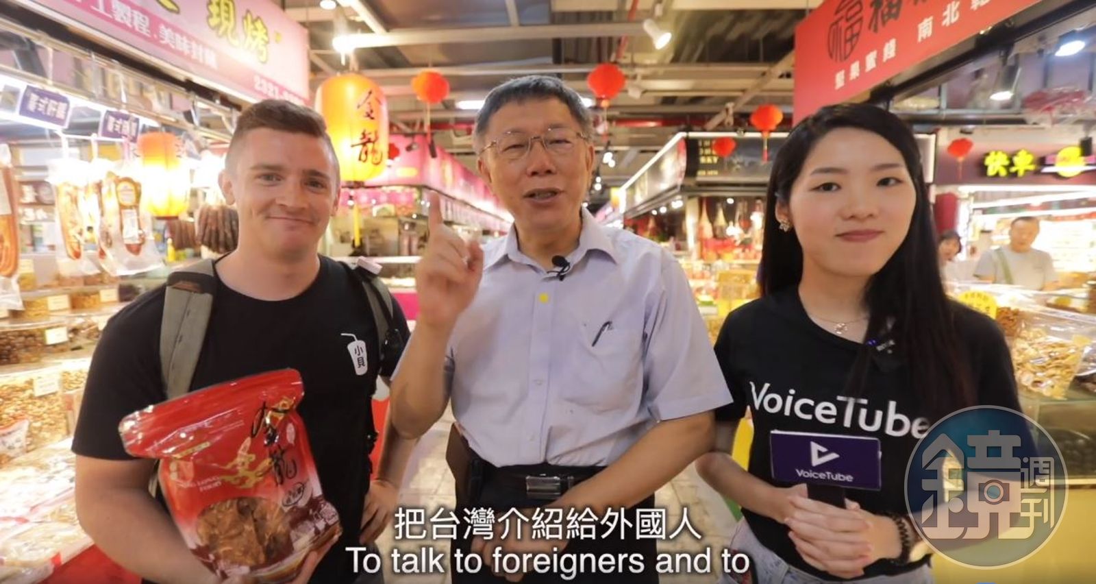 台北市長柯文哲攜手YouTuber 小貝等人,前進南門中繼市場體驗「無現金支付」及用英文介紹台灣美食。(翻攝自柯文哲 Facebook)影片中YouTuber 小貝不斷抽考菜市場攤販們的英文能力,舉凡像是冰糖蓮藕、馬拉糕及湖州臘味鮮肉粽等美食,攤販們都能透過英文的描述,帶領小貝找到正確的美食,面對外國客人,攤販們的溝通完全沒有問題。 台北市長柯文哲抽到的題目是「杏仁豬肉紙」,也完全難不倒攤販們,一下子就找到答案了!柯市長還親自示範「行動支付」的功能,免費請兩位來賓享用美食。柯市長說「現在政府在推無現金支付,菜市場現在都可以用行動支付」「大家都要認真學英文,把台灣介紹給外國人,讓世界看見台灣!」