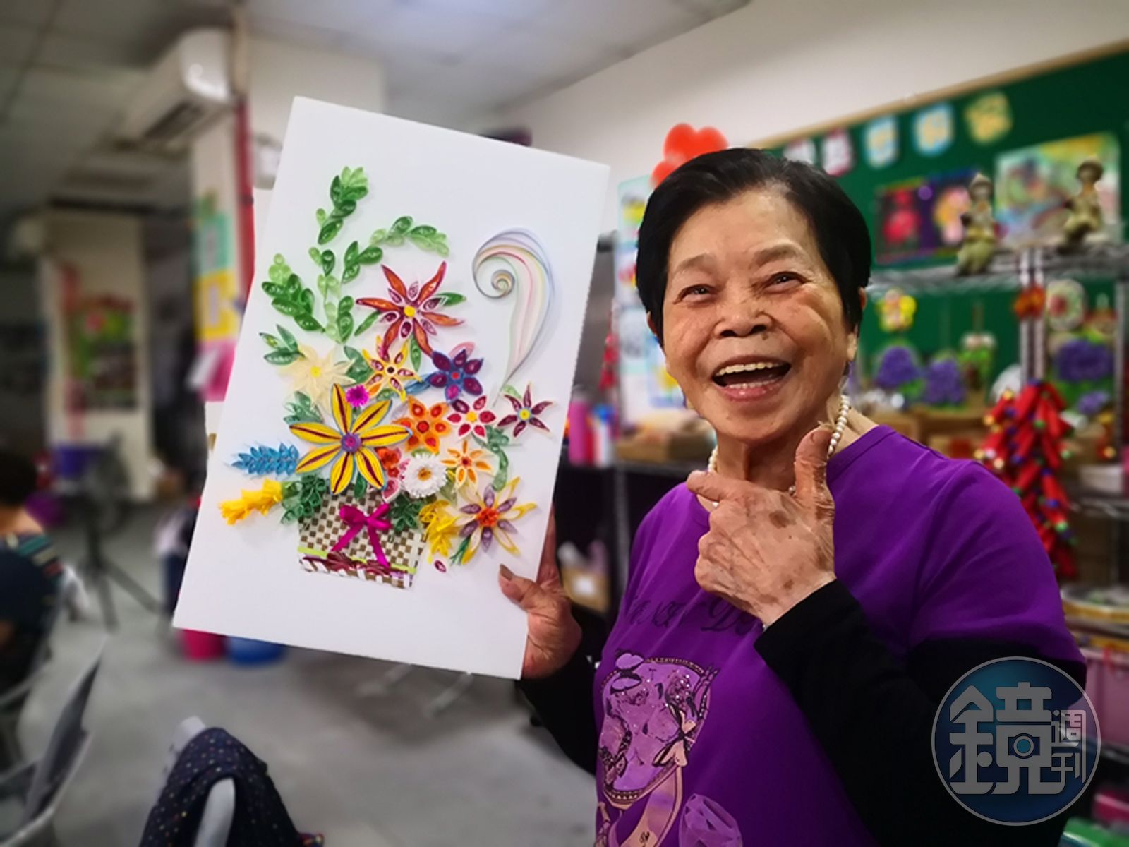 自由創作的捲紙畫配色縯粉,阿勉奶奶完成作品後笑開懷。(一粒麥子基金會提供)發布時間:2020.09.08 17:20 臺北時間