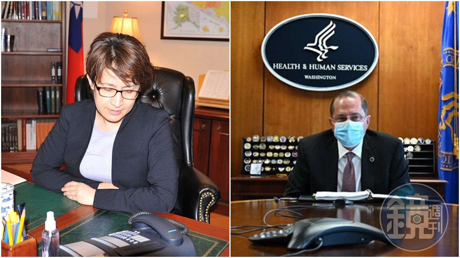 美國衛生部長阿札爾9日與我國駐美代表蕭美琴通話,內容提及台美正推行的合作計畫。(合成圖,翻攝自阿札爾推特、駐美代表處推特)發布時間:2020.09.10 11:31 臺北時間