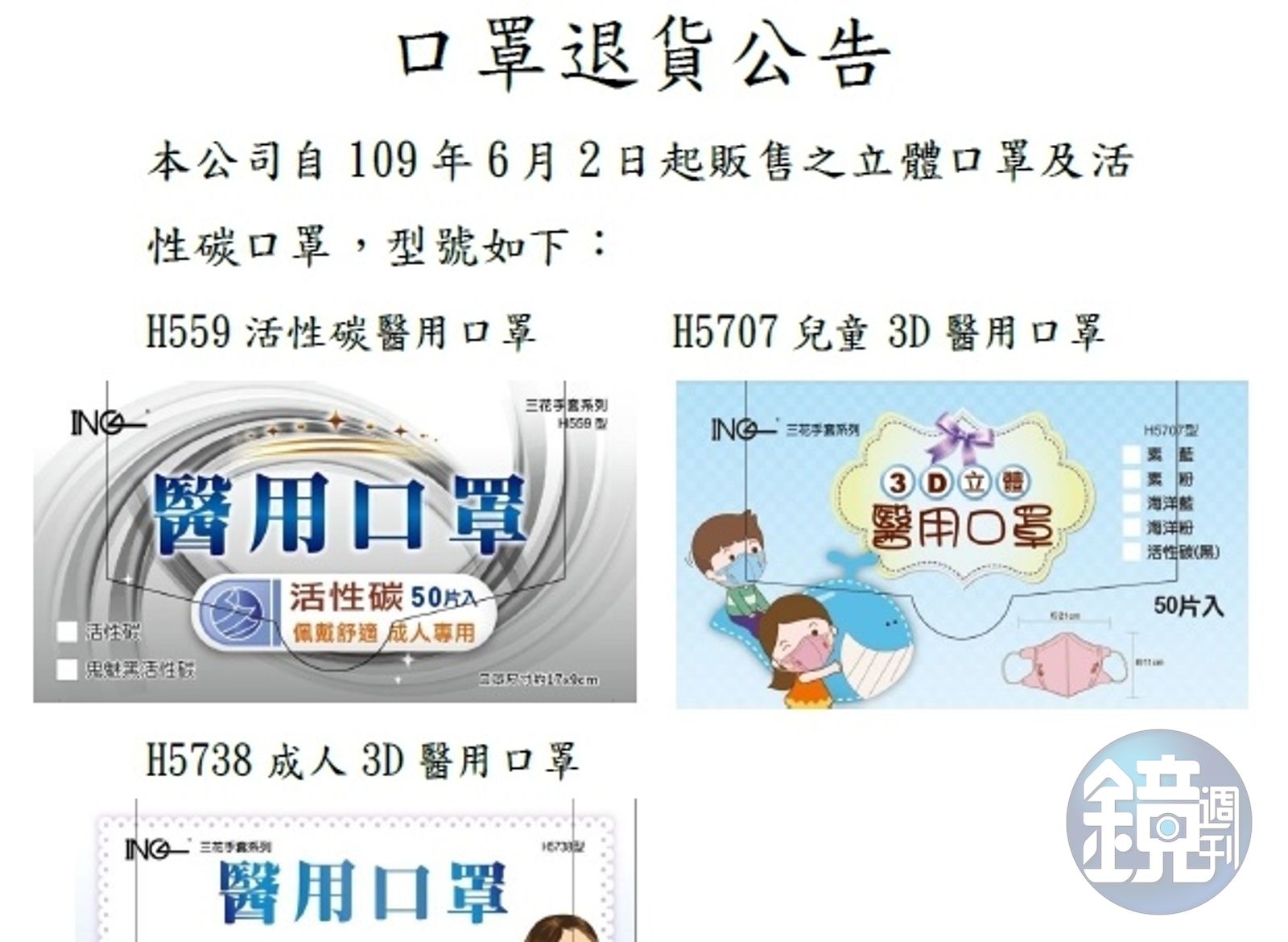 而豪品公司遭到警方約談後,也在官網公告3款口罩可供消費者退貨,分別為「H559活性碳醫用口罩」「H5707兒童3D醫用口罩」以及「H5738成人3D醫用口罩」,即日起攜帶購買證明和產品,至原購買處辦理退貨。