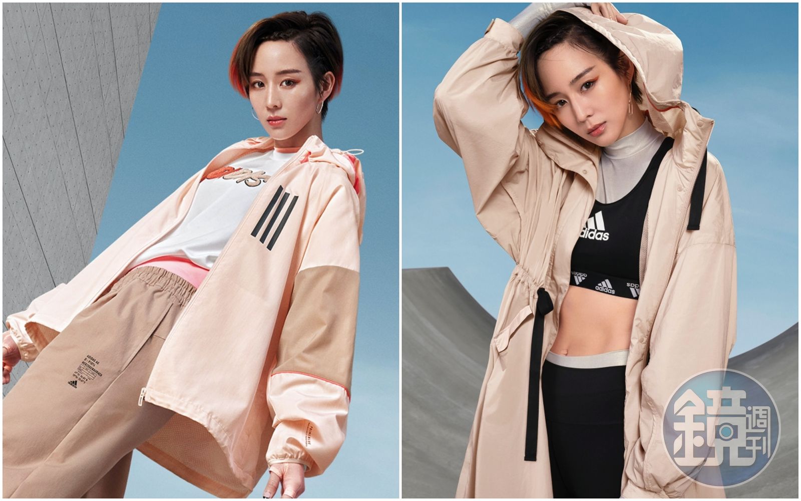 無論是正常風衣或是長版風衣,張鈞甯示範的奶茶色,甜美又有個性。(adidas提供)發布時間:2020.09.13 22:09 臺北時間