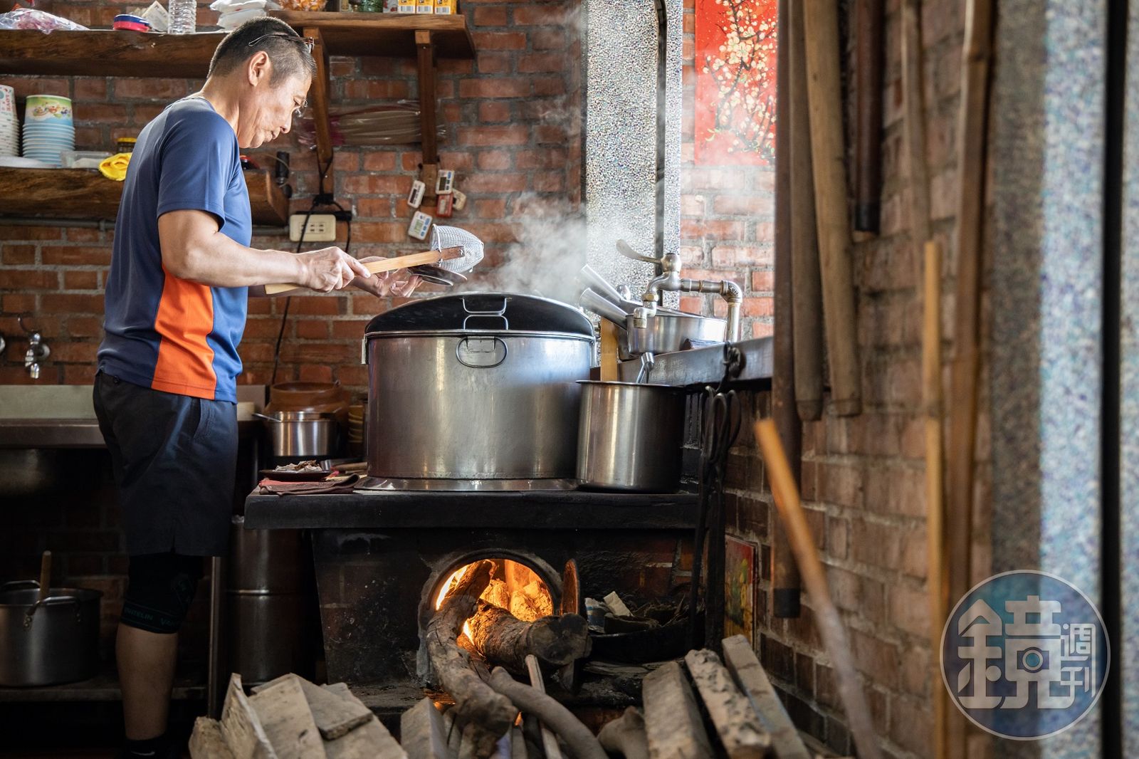 從當時6坪大的老店到現在新址店面,溫世和依舊延續當年的柴燒大灶,他認為儘管時代在變,但是好的東西就得傳承,柴燒大灶熬的豬骨湯頭就是不一樣。每天凌晨4點就起床買菜,接著準備起灶,麵店所用的木柴,是附近蜜棗農家修枝下來的樹枝,從早上6點升火一直到晚上,柴火不曾熄過,得時刻用心留意。