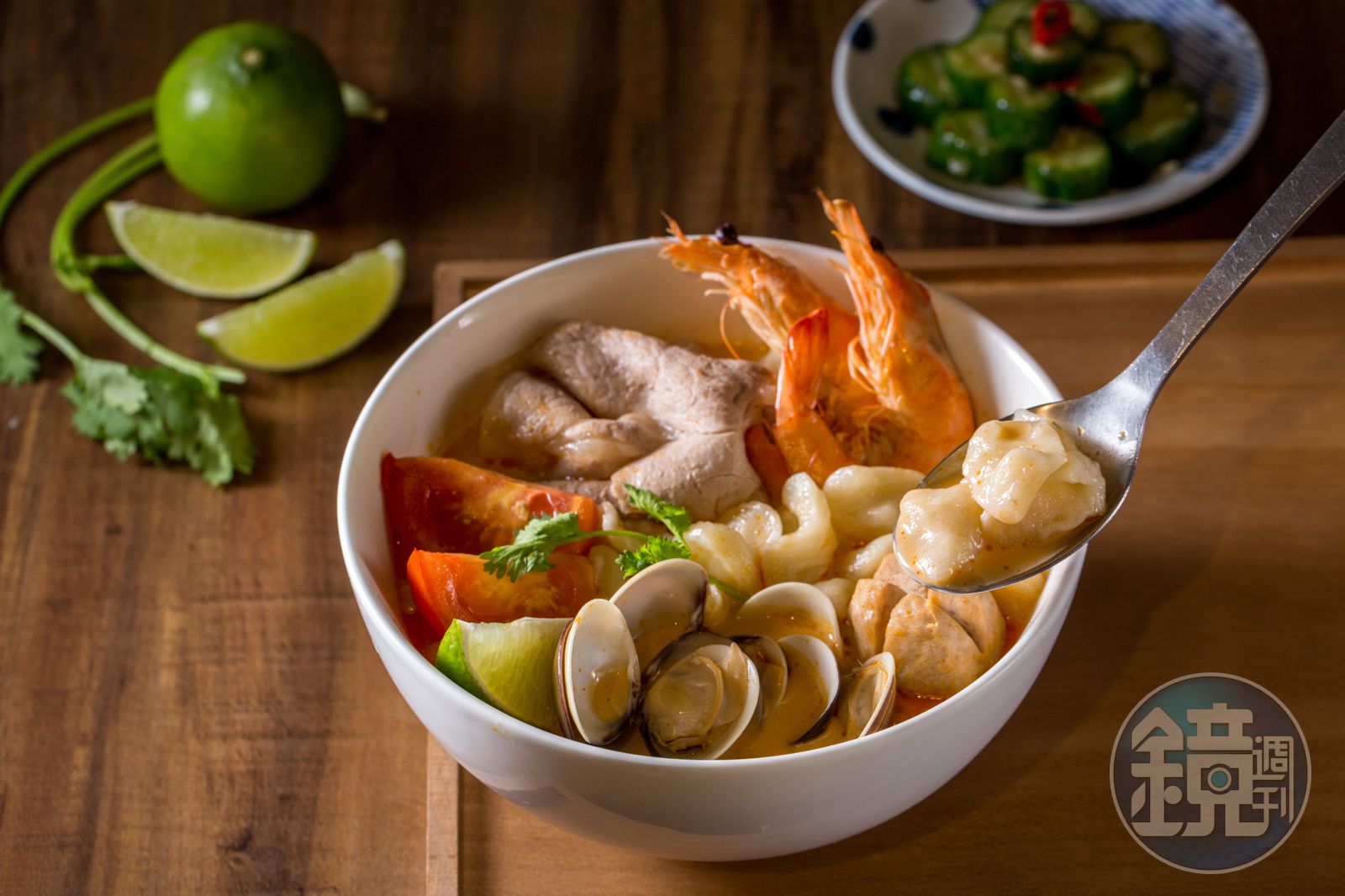 老闆彭駿鳴的手藝傳承自在新北市三重開麵疙瘩店的媽媽,年輕人對傳統麵食有新想法,改良傳統麵疙瘩配方作法,小巧麵體浸泡在湯裡,4個角不容易泡爛之外,中間不過生,咬勁很足,配上粉橘色湯頭的「泰式東央貢海陸麵疙瘩」,鮮辣柔潤。