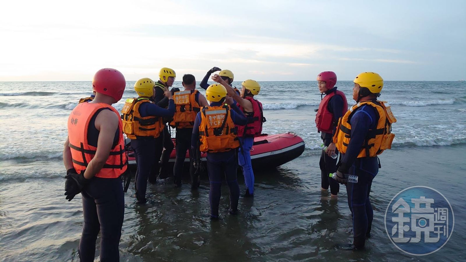 警消、海巡署、空勤總隊「海空總動員」,昨天總計動員50人次,出動一架直昇機、6艘海巡船艇,加上當地漁民的船筏10幾艘,另有空拍機也協助在海面搜尋,可是天很快黑了,因視線不良而一無所獲。