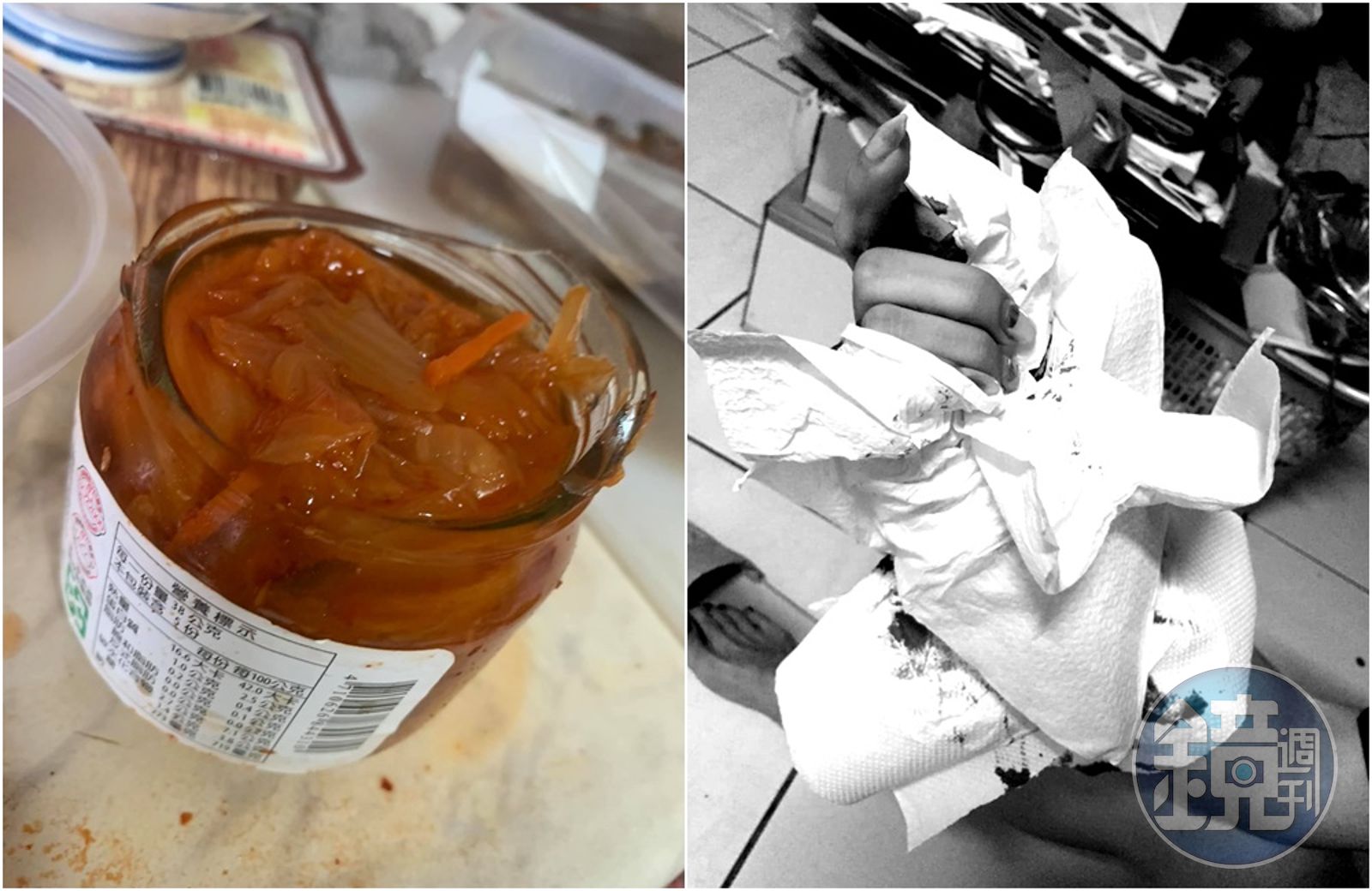 一名女網友在「爆料公社」發文,表示自己15日到超市購買韓式罐裝泡菜,16日轉開罐頭準備料理,因為怕玻璃罐比較難打開,先用刀背輕輕敲瓶蓋再旋轉開瓶,不料一扭下去,瓶身竟瞬間爆裂,爆出的玻璃碎片插進手指,當場血流不止,趕忙送急診縫了6針。