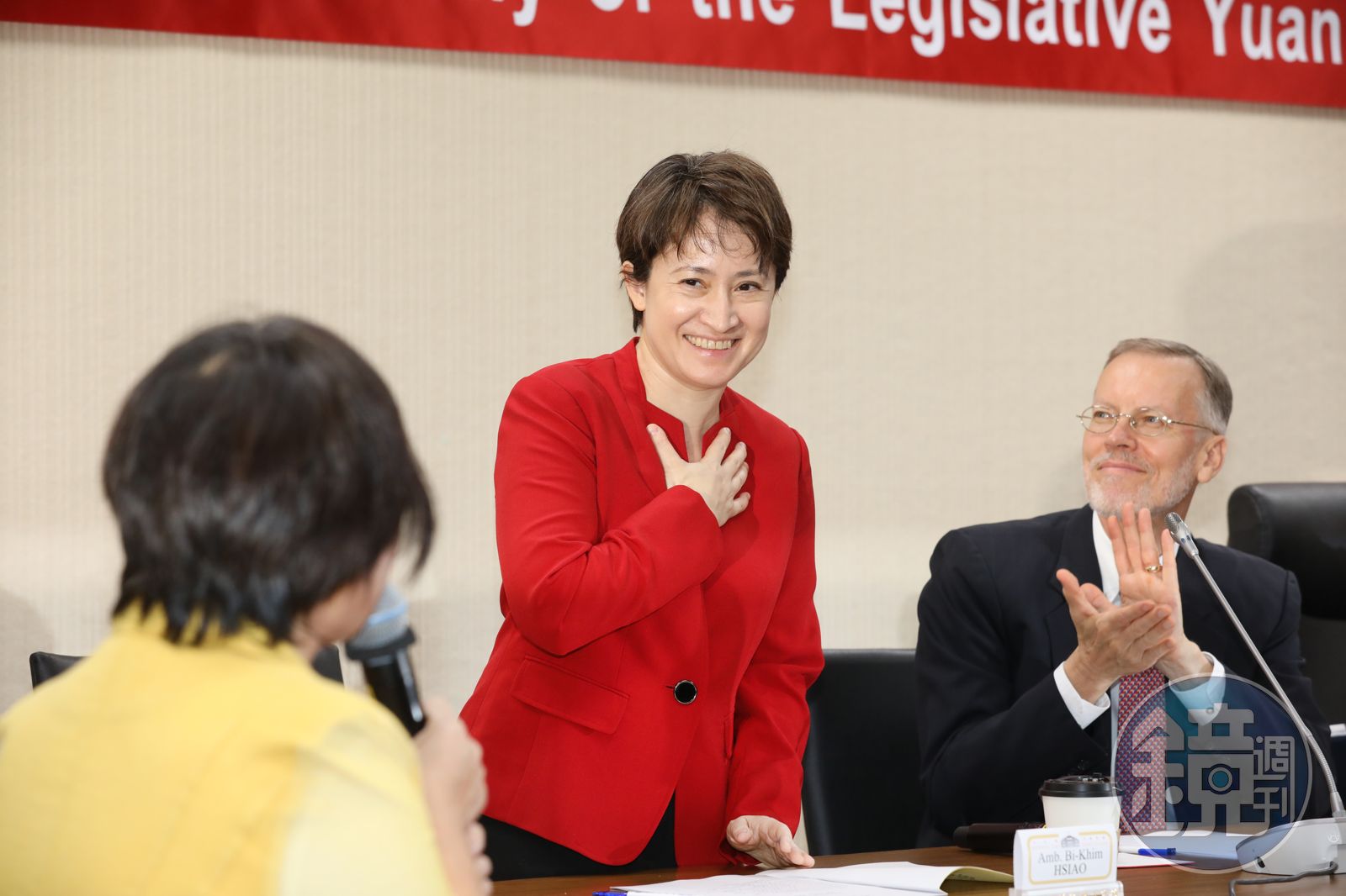 蕭美琴表示,在7月底到任後,她像拚命三郎般一直努力跟各界接觸、溝通、爭取,盼長期台灣在國際上碰到的不公平待遇能夠有所改善。在代表處同仁一起努力下,有些事情確實有所進展,美方對我們許多的訴求也多正面看待。但是,每一步都是艱辛,也不可否認,雙邊關係的法律結構,以及美國的政策框架「一中政策」還是存在著。