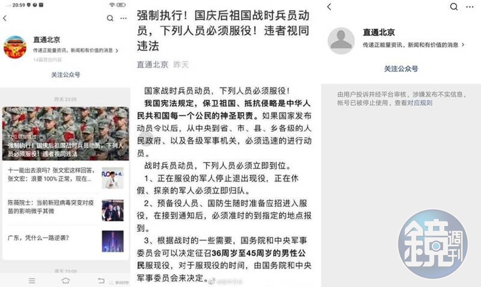 不過消息一曝光,隨即整個帳號直接被官方刪除,並註記為「散布不實訊息」,不過該文章仍被轉發到其他微信公眾號,事件也在微博上引起高度關注,對此,官方仍不出面回應,因此讓中國網友紛紛推測,「北京直通」被消失的原因可能是「洩密了」,直言依照過去官方作風,「若是謠言,官方肯定會出來說幾句話」,但也有中國網友指出,上月百度也有相同文章,差別在於沒說是「國慶後」實施戰時動員。 對此,消息一曝光,也在台PTT引起高度關注,不少網友紛紛表示,「是不是假消息?」「徵召一堆中年肥宅可以幹嘛」「你哪隻眼睛看到開始徵兵」「老實說,中國並不缺兵啊,窮人那麼多」,也有網友猜測「中國這種現代戰爭還在打人力??除非是內戰」,相關消息仍待證實。 更新時間|2023.09.12 20:35 臺北時間